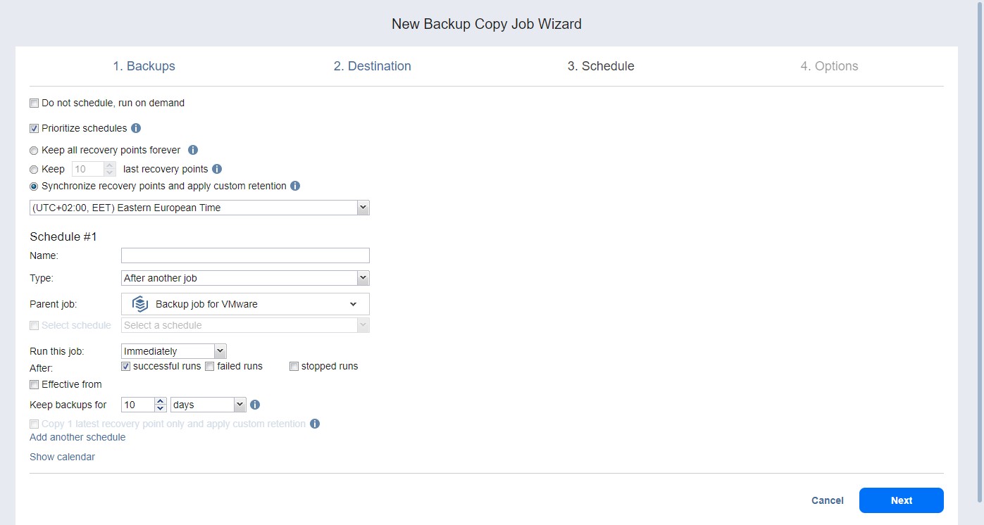 Prioritize schedules: When this option is selected, NAKIVO Backup & Replication starts treating schedules based on their priority. The Yearly schedule will have higher priority than the Monthly schedule, etc. In case 2 or more schedules overlap, the schedules with lower priority will be skipped.