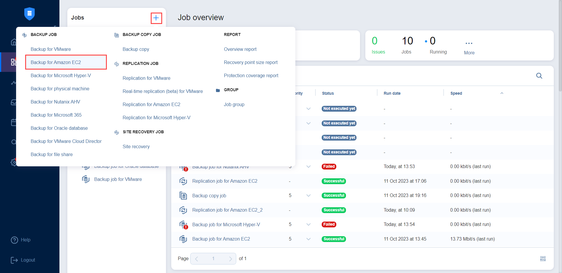 With NAKIVO Backup & Replication, you can back up Amazon EC2 instances by creating a backup job that specifies which instances should be backed up, where the backups should be located, how often the backup should occur, and what backup options should be used. To create a backup job, click the plus Create button in the Data Protection menu, and then click Backup for Amazon EC2.