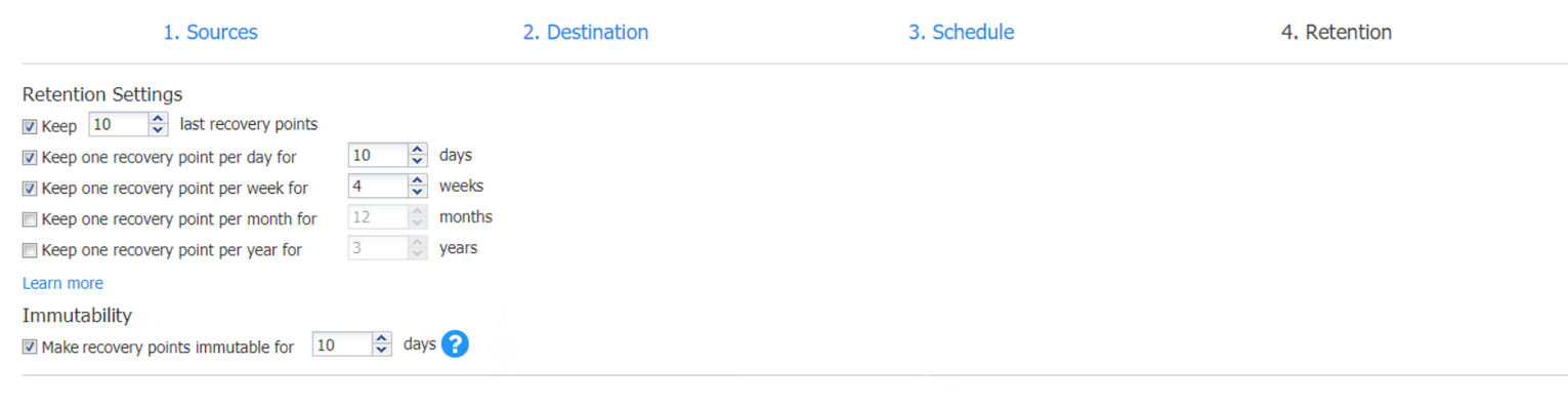 For more details and an example of job retention settings, refer to the Keeping Recovery Points article in the Knowledge Base.