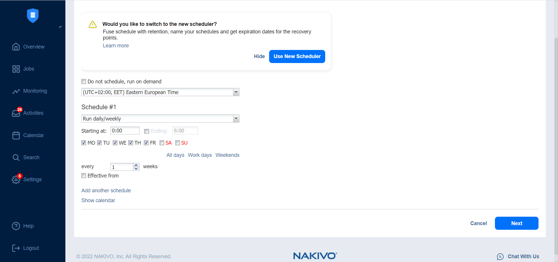 NAKIVO Backup & Replication offers two approaches to retention and scheduling: the legacy or the improved approach. To learn more about how the legacy and improved approaches work, go here. If you create a new job or edit the existing one that uses the legacy approach, a popup appears offering that you to switch to the improved retention approach in the following cases: