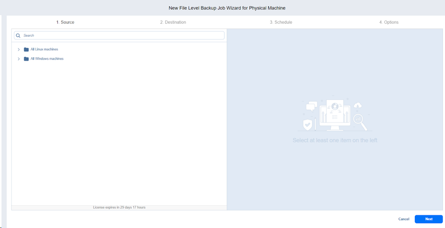 To create a file level backup job, click the Create (+) button in the Jobs menu and then click File level backup for physical machine. The New File Level Backup Wizard for Physical Machine opens.