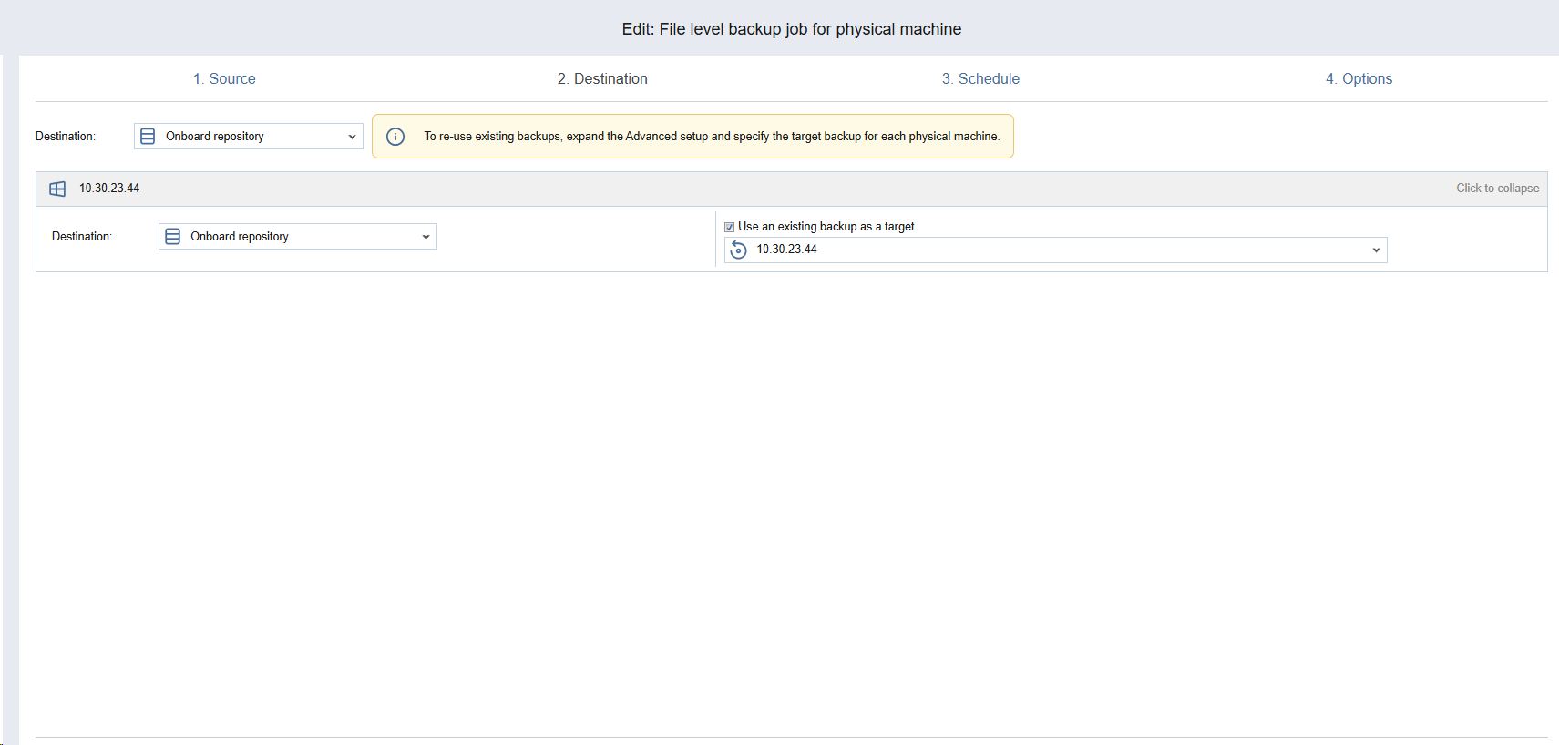 In this step, you can select to Setting a Single Backup Repository for All Folders or Mapping Source Machines to Existing Backups.