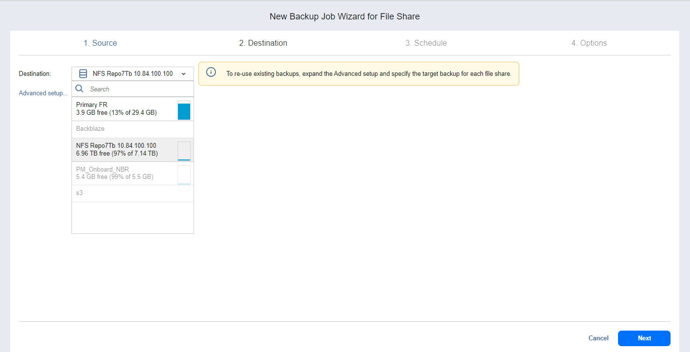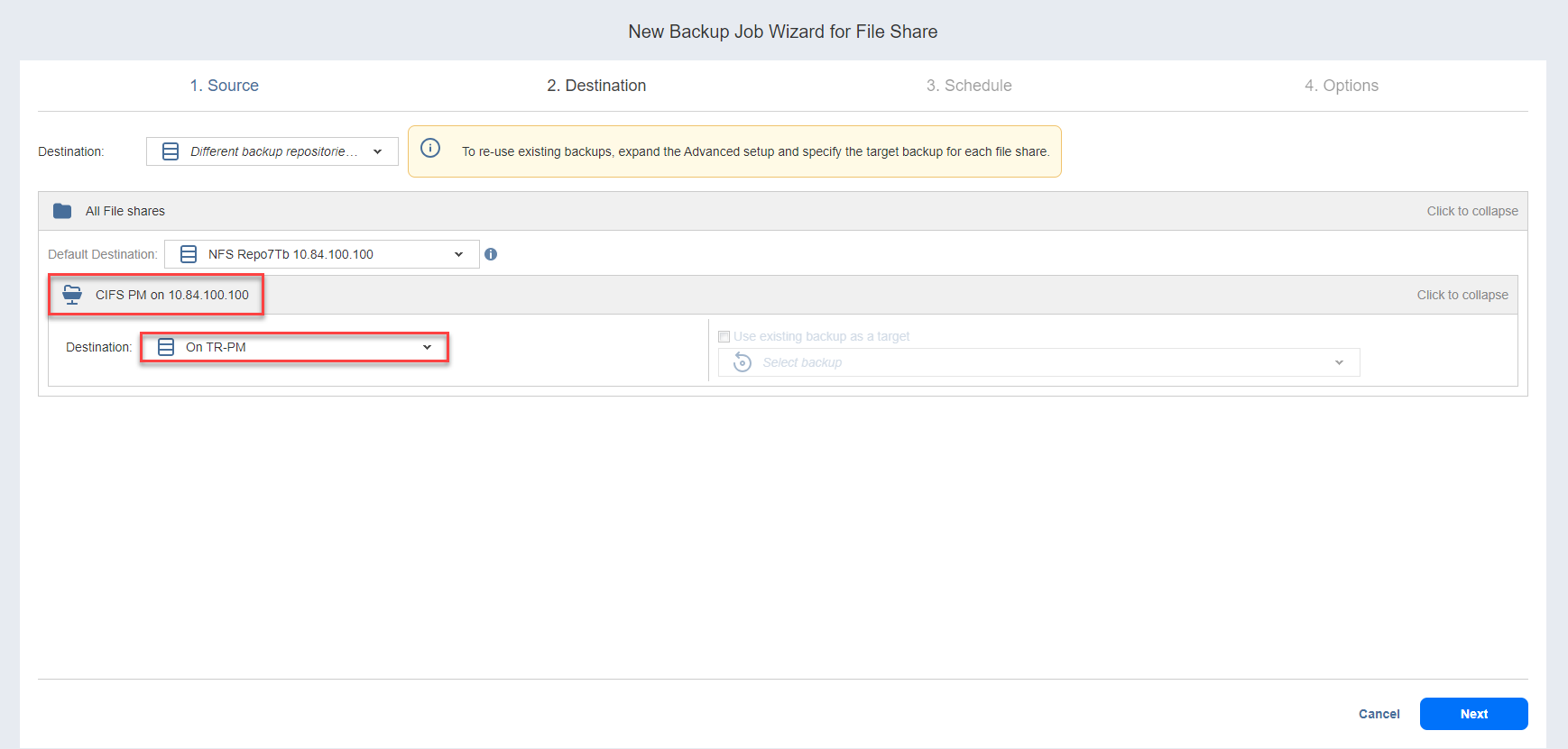 In the share boxes, choose a different backup repository for each share individually from the Destination drop-down list.