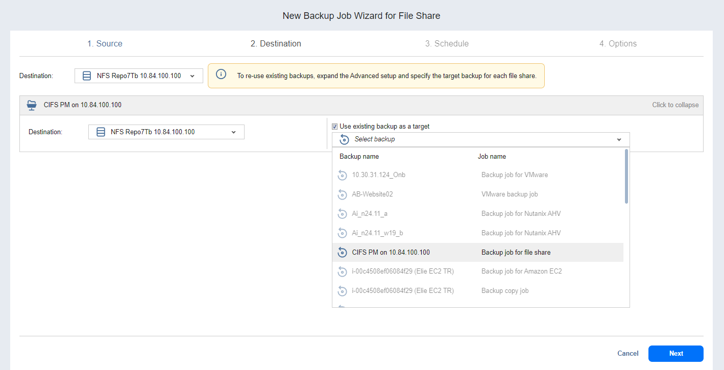 Select the Use existing backup as a target checkbox and then select an existing backup from the drop-down list and proceed to the next step.