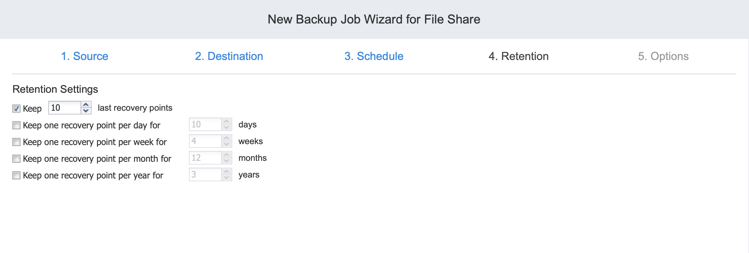 - Keep x last recovery points: Retains the specified number of last recovery points for each file share in the job.