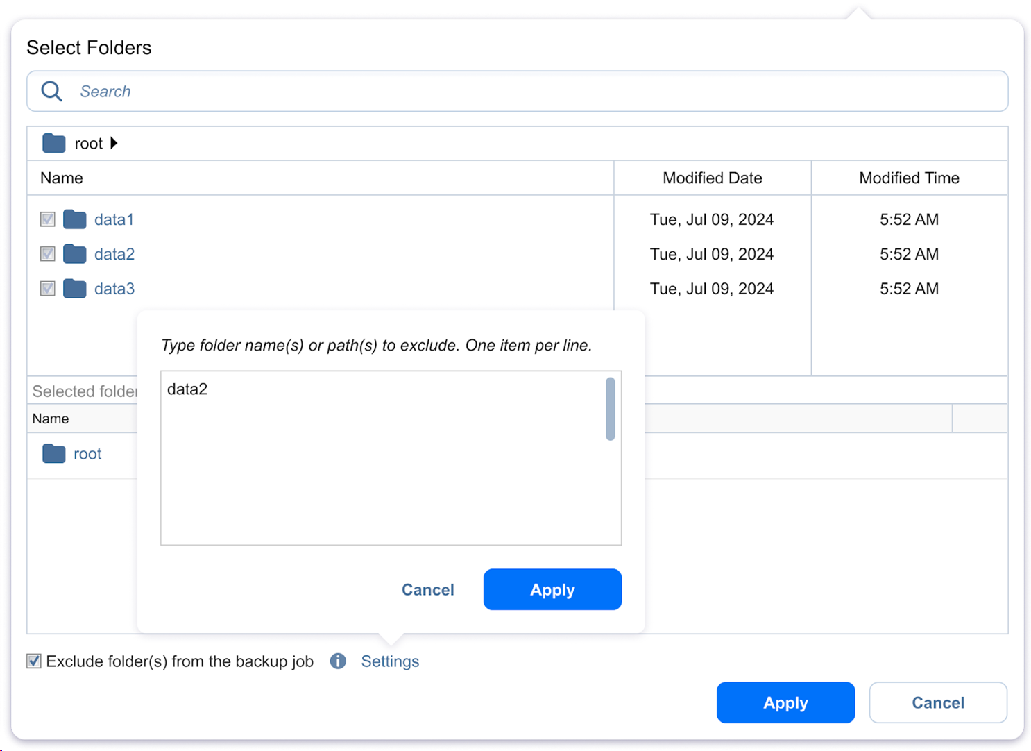 Selecting the root folder automatically selects all the current folders and new folders under it. You can deselect the root folder to manually select the folders you want to add to the file share backup job.