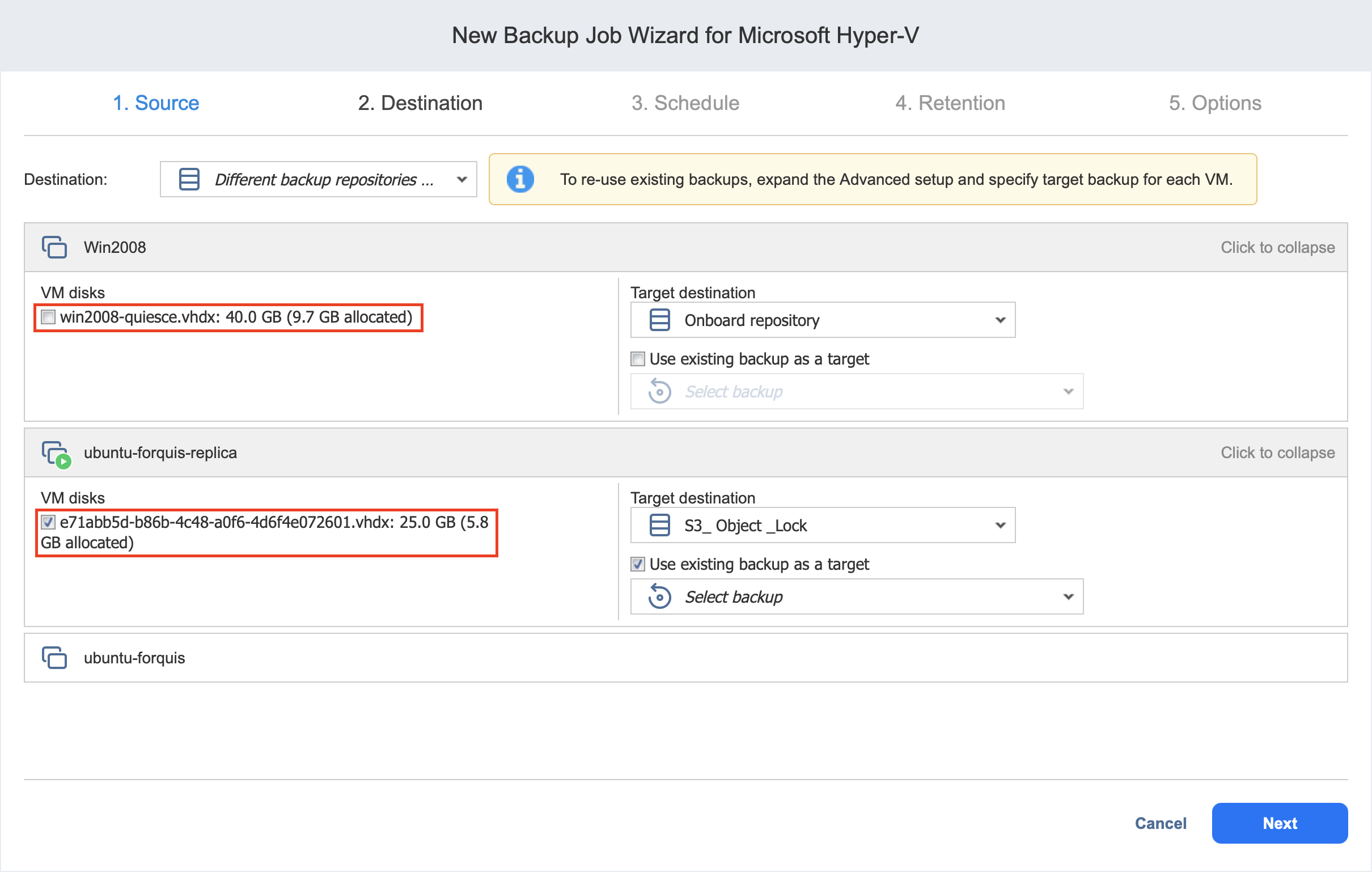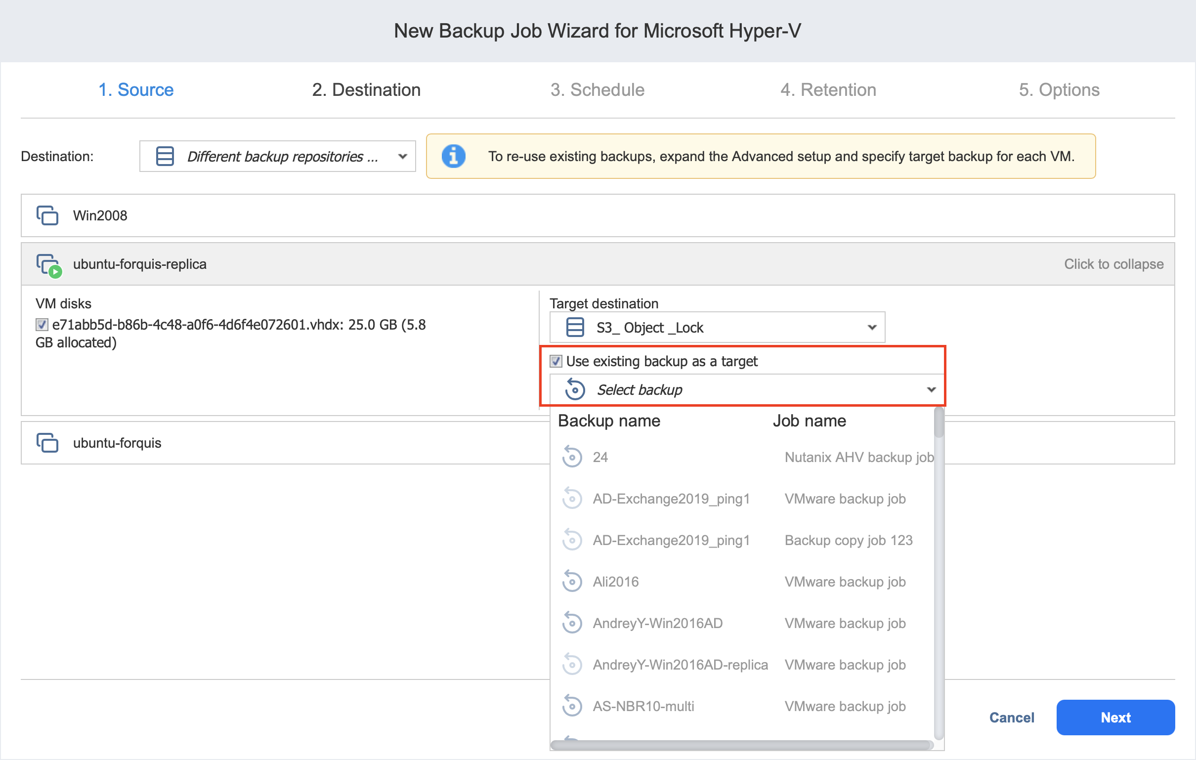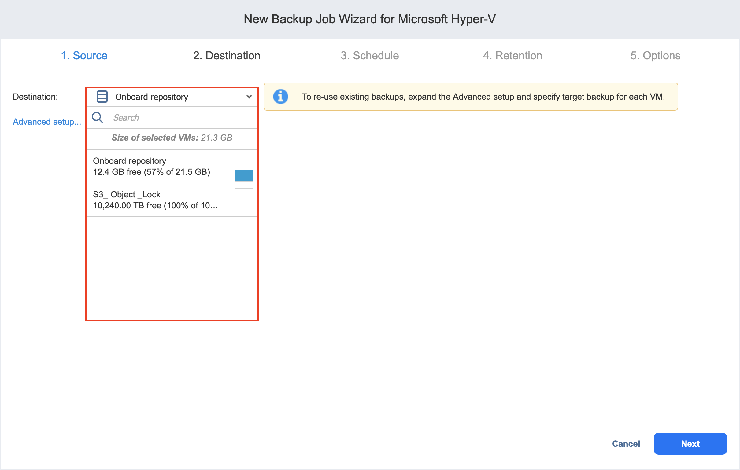 From the Destination drop-down list, choose a Backup Repository that contains an existing VM backup.
