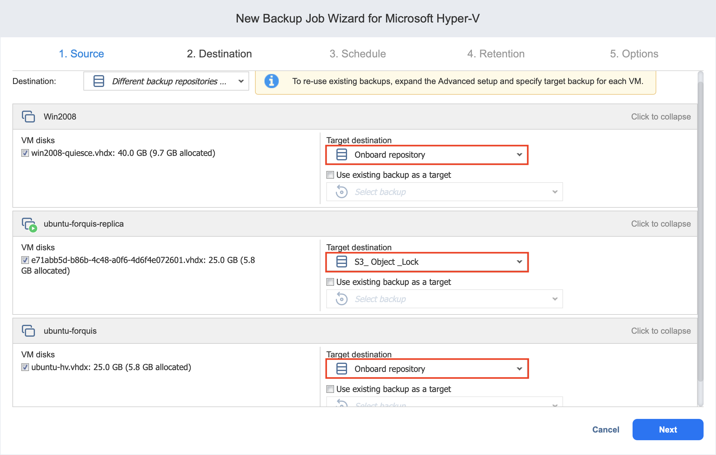 On the Destination page of the wizard, you can select one or multiple different Backup Repositories to back up your Hyper-V VMs.