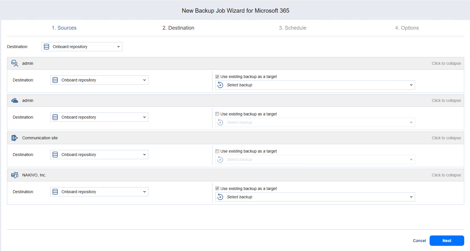To back up all items selected on the Sources page to a single Backup Repository, choose a Backup Repository from the Destination drop-down list.
