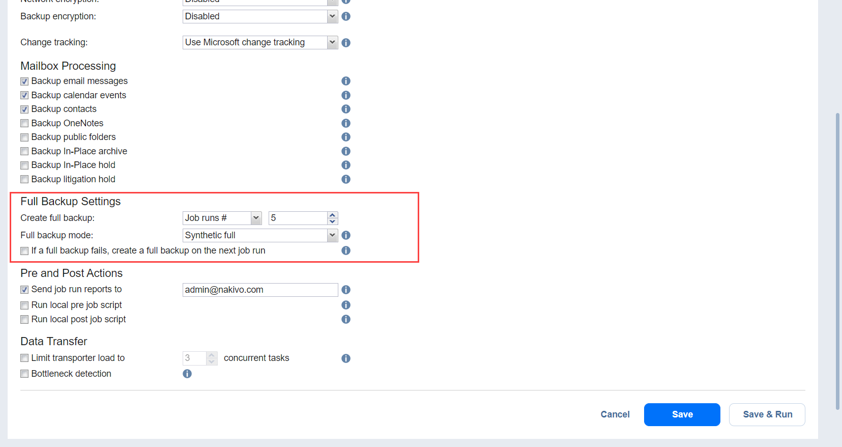 • If a full backup fails, create a full backup on the next job run: With this option selected, the next job run creates a full backup if the current job run fails to do so.