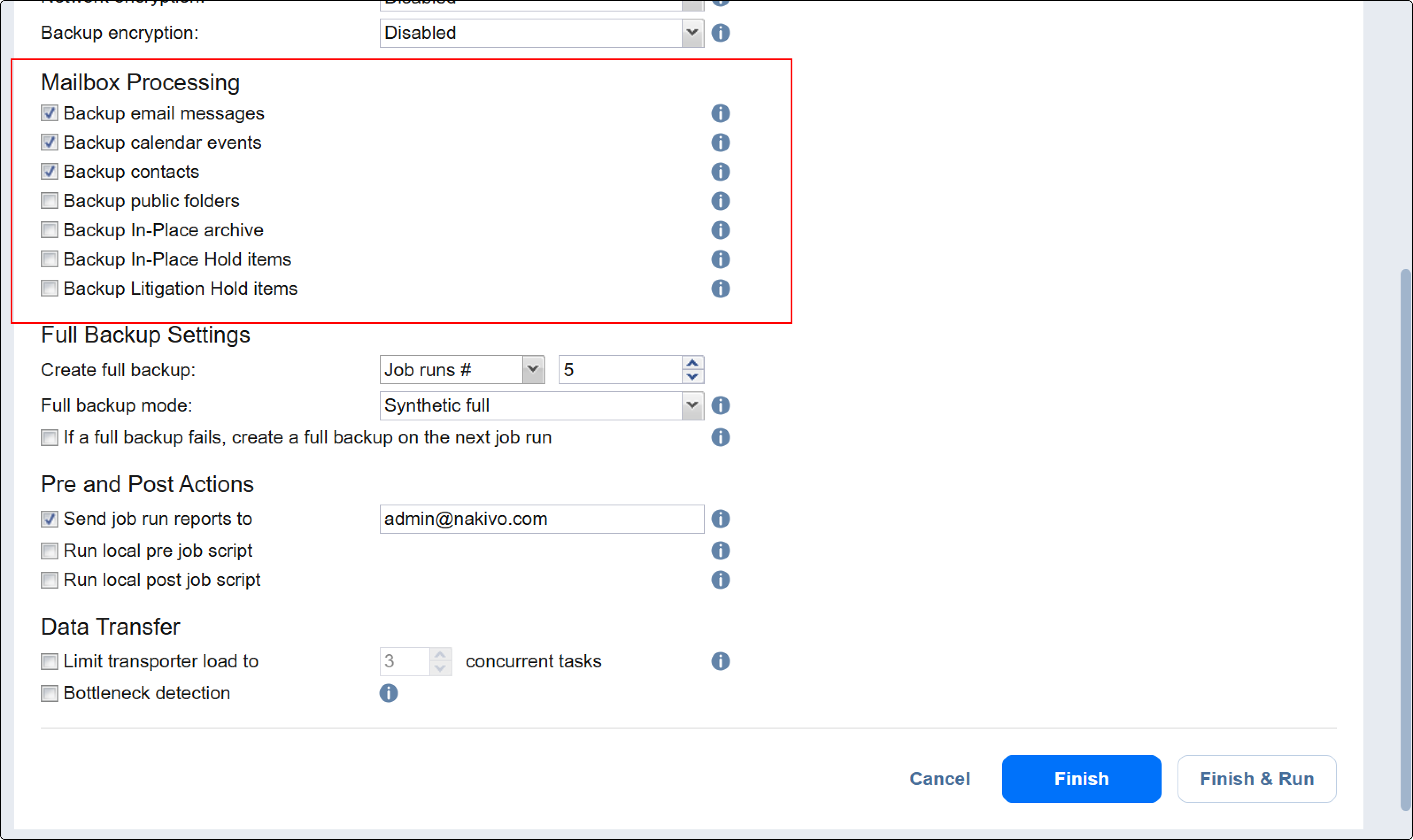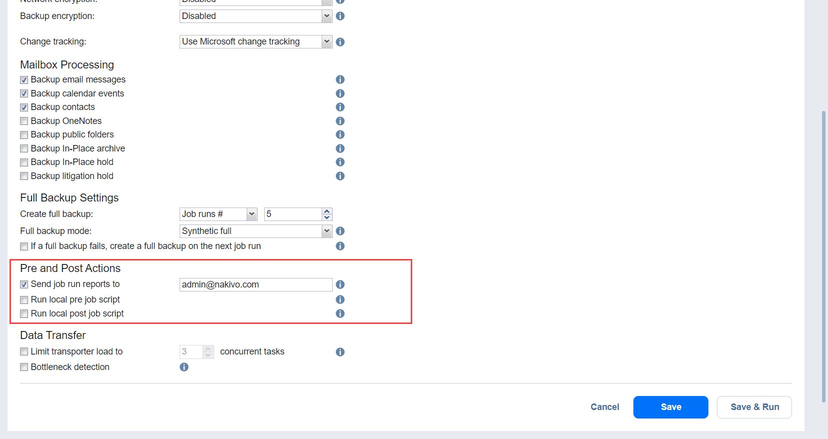 With NAKIVO Backup & Replication, you can enable certain actions before a backup job begins and after it is completed. You can choose to send job run reports and run local pre- and post-job scripts. For more information, refer to Pre and Post Job Scripts.