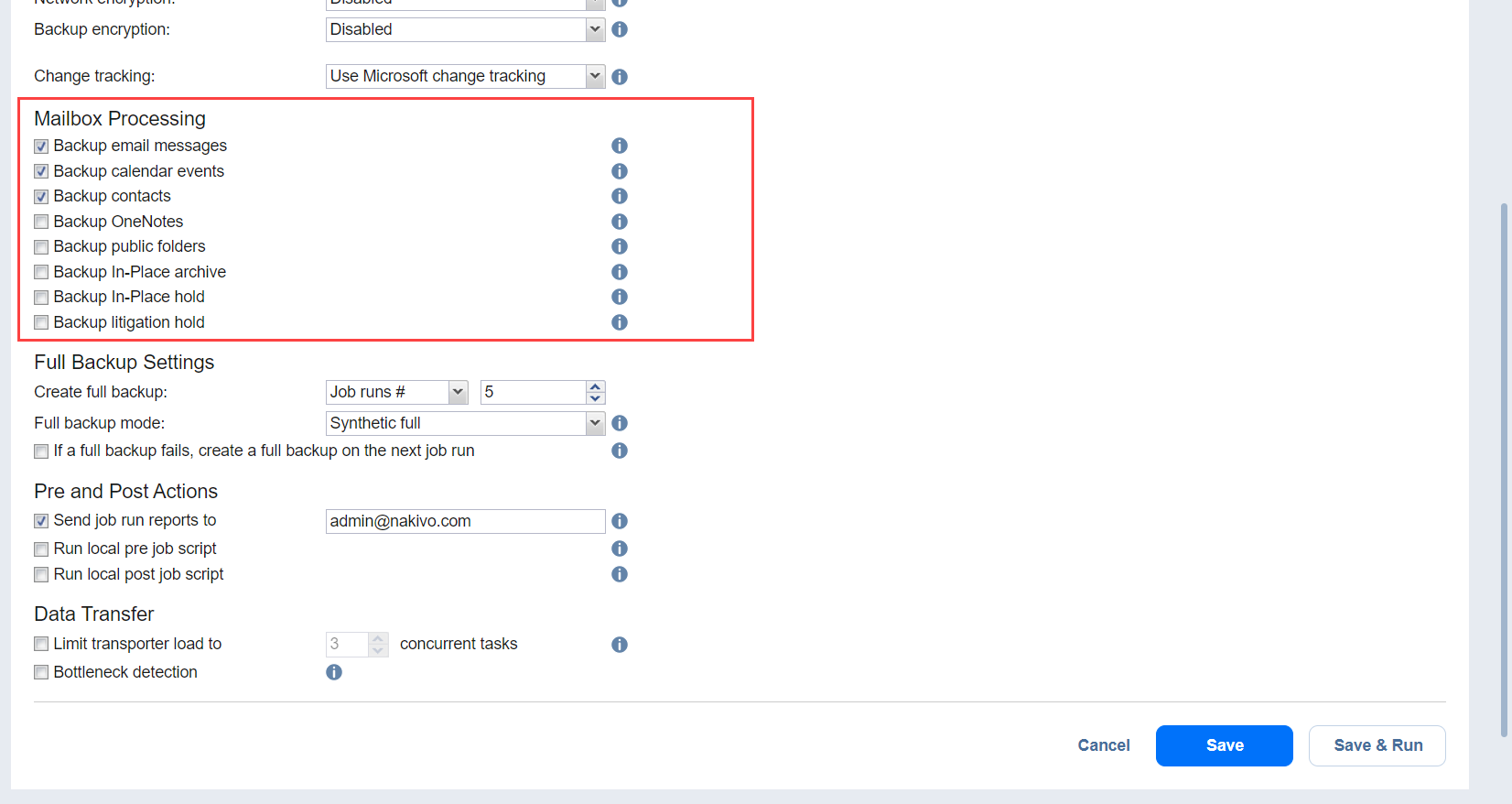 • Use Microsoft change tracking: With this option selected, after the initial job run, NAKIVO Backup & Replication uses Microsoft APIs to process exclusively the changed data from the last job run. This allows for a significant increase in processing speed.