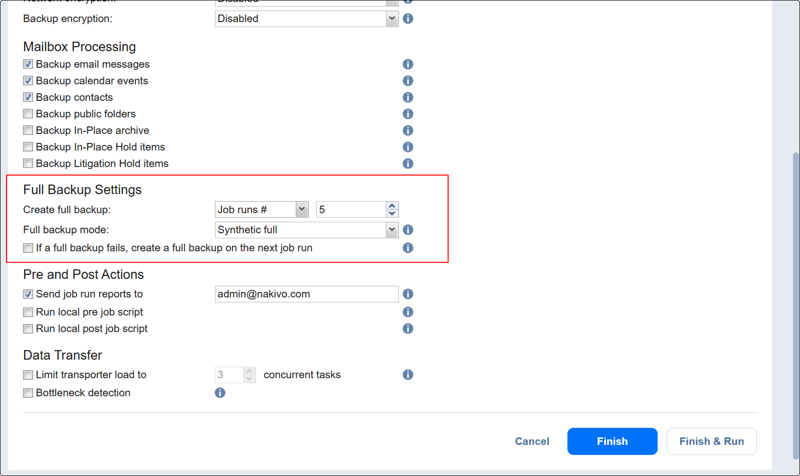 If a full backup fails, create a full backup on the next job run: With this option selected, the next job run creates a full backup if the current job run fails to do so.