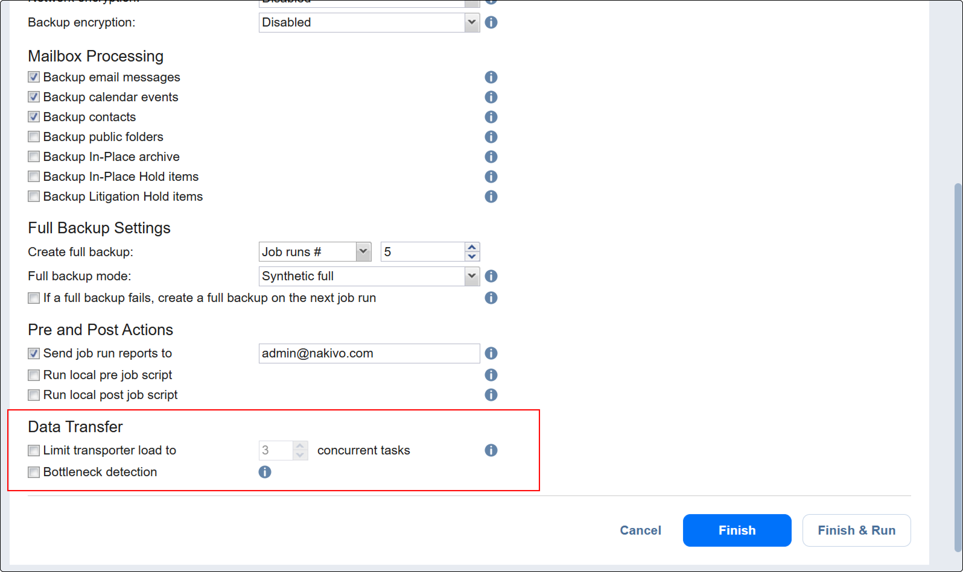 When the Bottleneck detection option is enabled, additional information is collected and recorded in NAKIVO Backup & Replication logs in the course of data transfer for the purpose of bottleneck detection. Check this option to enable the Bottleneck detection capability of the Transporters engaged in the job.