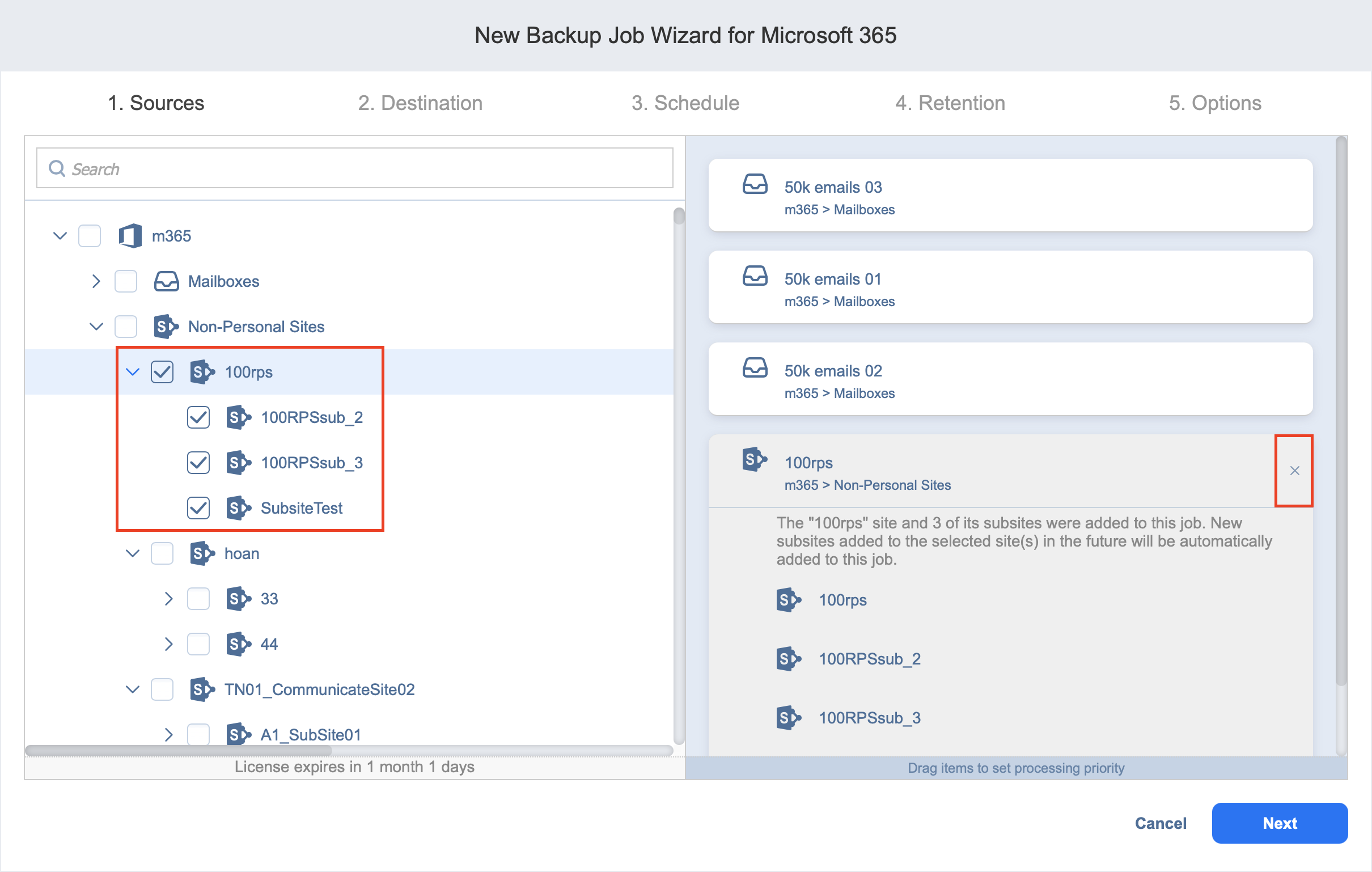 • If you select a Microsoft 365 account, all mailboxes, SharePoint sites, OneDrives, and Teams contained in that account are added to the backup job.