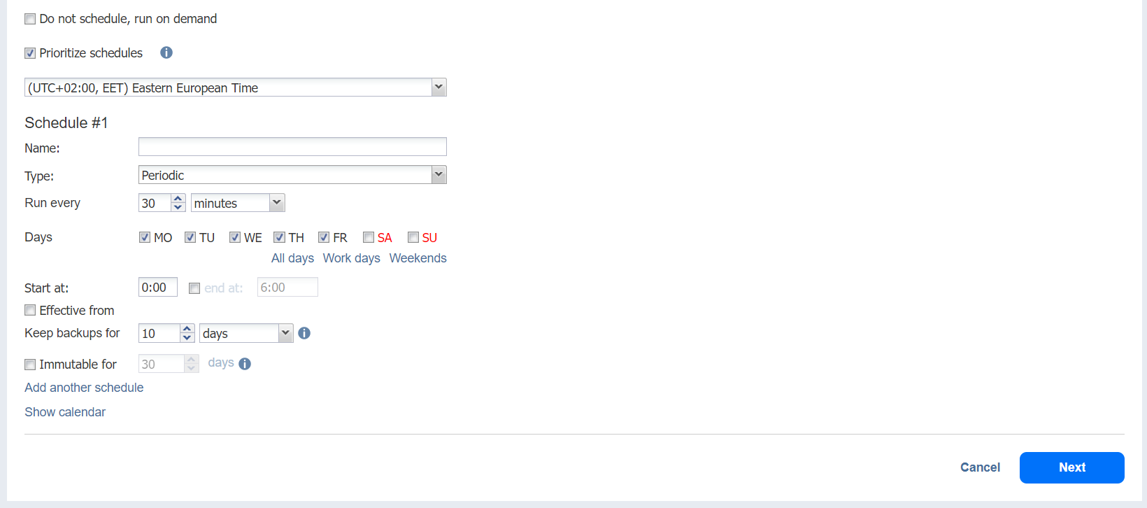 Prioritize schedules: When this option is selected, NAKIVO Backup & Replication starts treating schedules based on their priority. The Yearly schedule will have higher priority than the Monthly schedule, etc. In case 2 or more schedules overlap, the schedules with lower priority will be skipped.