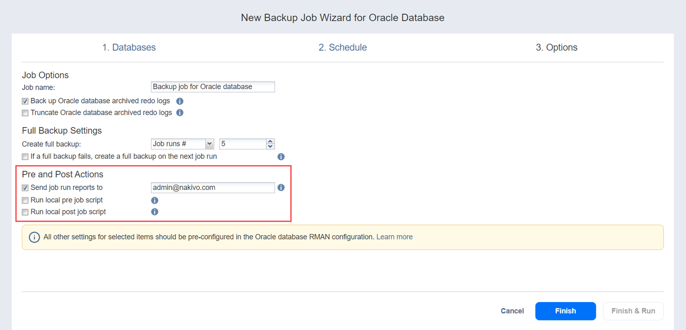 On the Options page of the wizard, you can name the job, choose to back up and truncate Oracle database archived redo logs, set full backups as well as pre and post job actions.