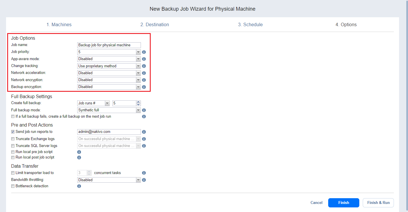 NAKIVO Backup & Replication can send email notifications to specified recipients on job completion status. This feature complements global notifications and provides you with the ability to configure notifications on a per-job level.