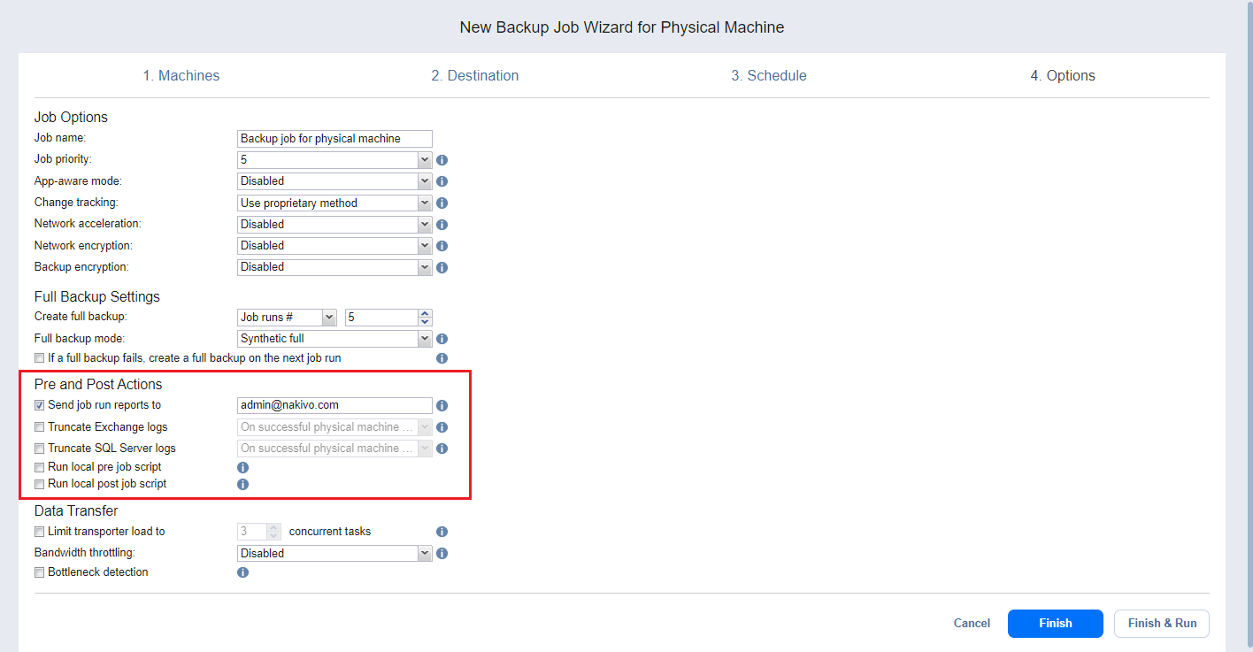NAKIVO Backup & Replication provides you with the ability to enable certain actions before a backup job begins and after it has completed. You can choose to send job run reports, truncate Microsoft Exchange and SQL Server logs and run local pre and post job scripts.