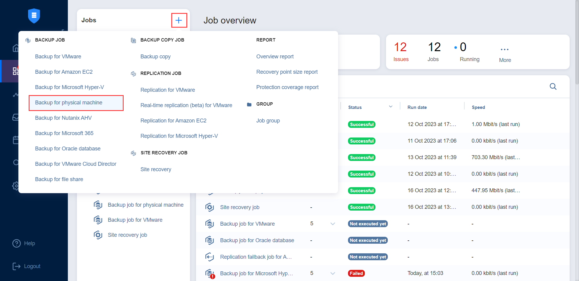 With NAKIVO Backup & Replication, you can back up both Windows and Linux physical machines. This can be done by creating a physical machine backup job that specifies which machines should be backed up, where the backups should be located, how often the backup should occur, and what backup options should be used. To create a physical machine backup job, click the plus Create button in the Data Protection menu and then click Backup for physical machine.