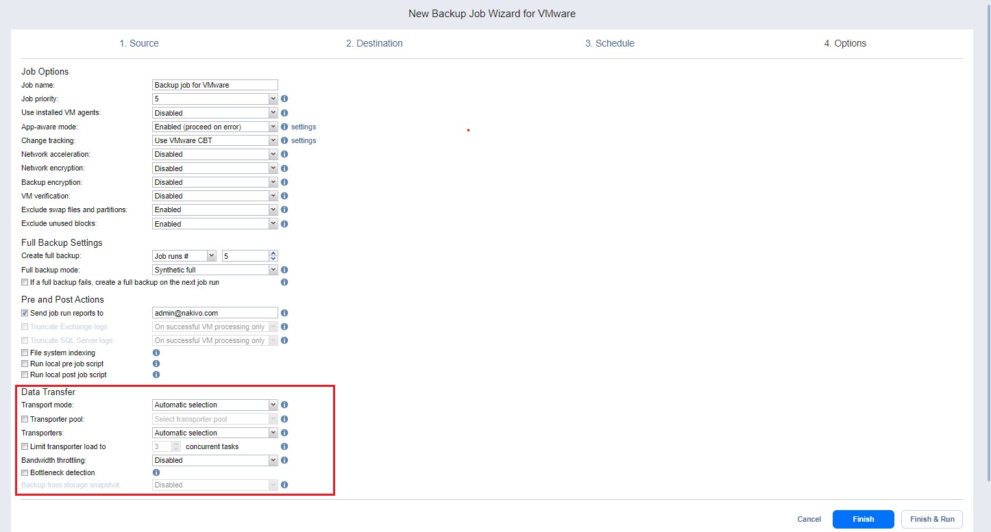 In the Data Transfer section of the Options page, you can choose a transport mode, select a Transporter to be used for reading data from source VMs, specify a b load, and configure bandwidth throttling.