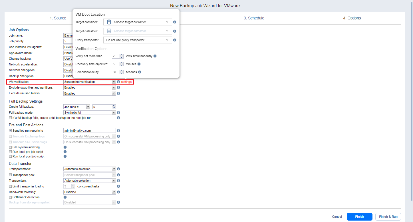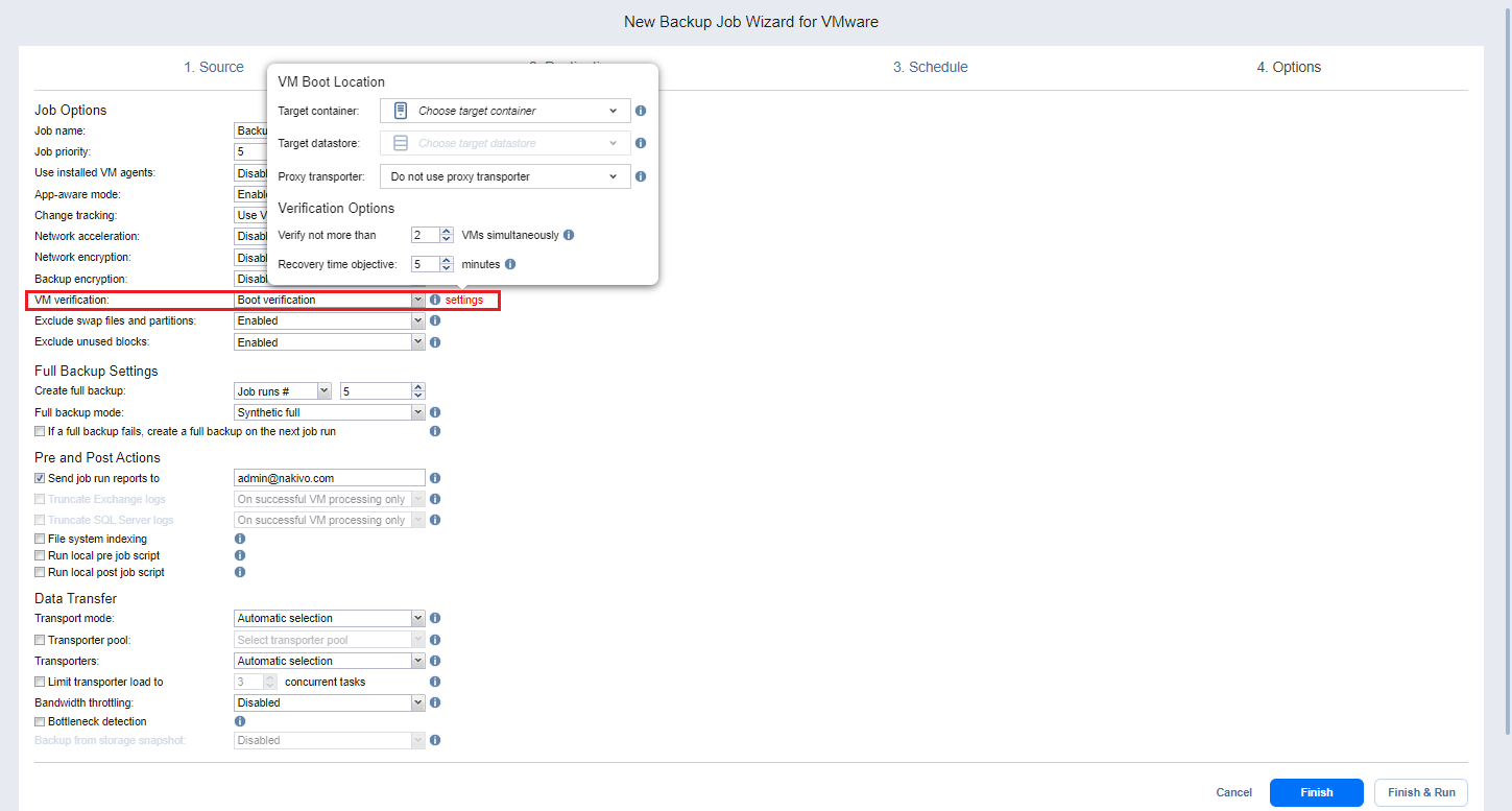 Boot verification: When enabled, all VM backups created by the job are verified as follows. After a VM backup is completed, NAKIVO Backup & Replication recovers the VM using Flash boot, disables networking to prevent network connections, and verifies that system start is successful.