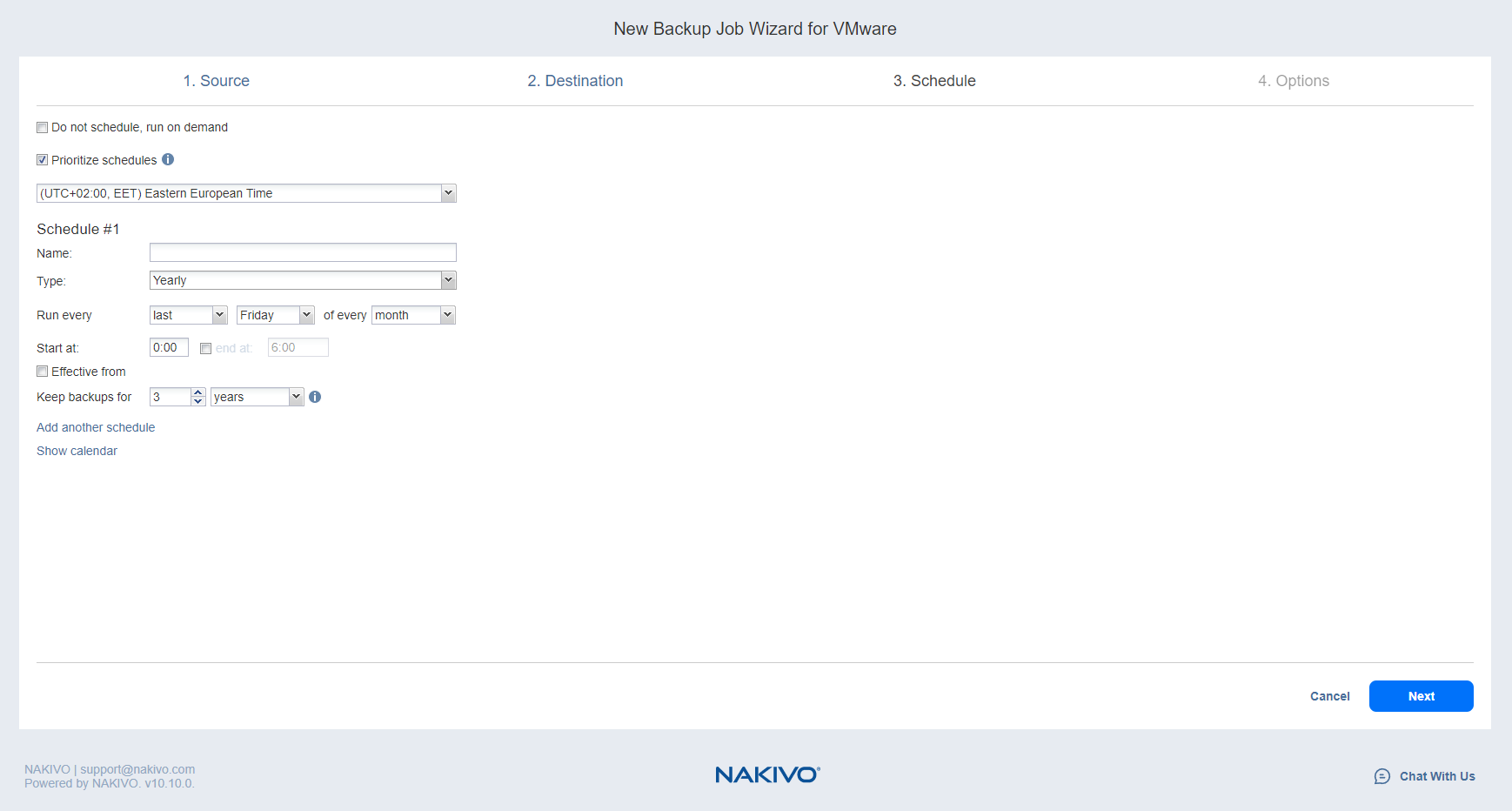 • Prioritize schedules: When this option is selected, NAKIVO Backup & Replication starts treating schedules based on their priority. The Yearly schedule will have higher priority than the Monthly schedule, etc. In case 2 or more schedules overlap, the schedules with lower priority will be skipped.