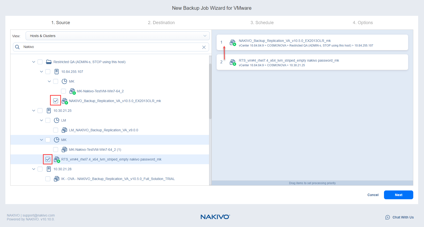 The selected items appear in the right pane of the page. You can drag a VM or a container with the pointer to a new position to reorder the selected items. By doing that, you can specify to back up the most important VMs first.