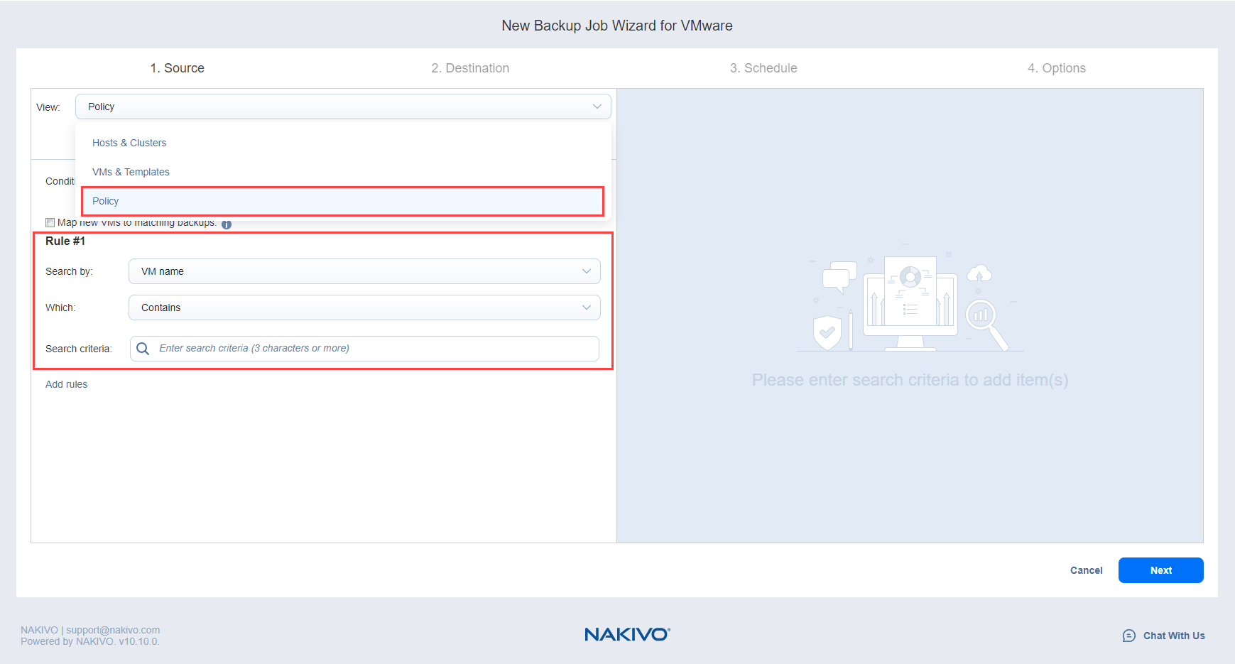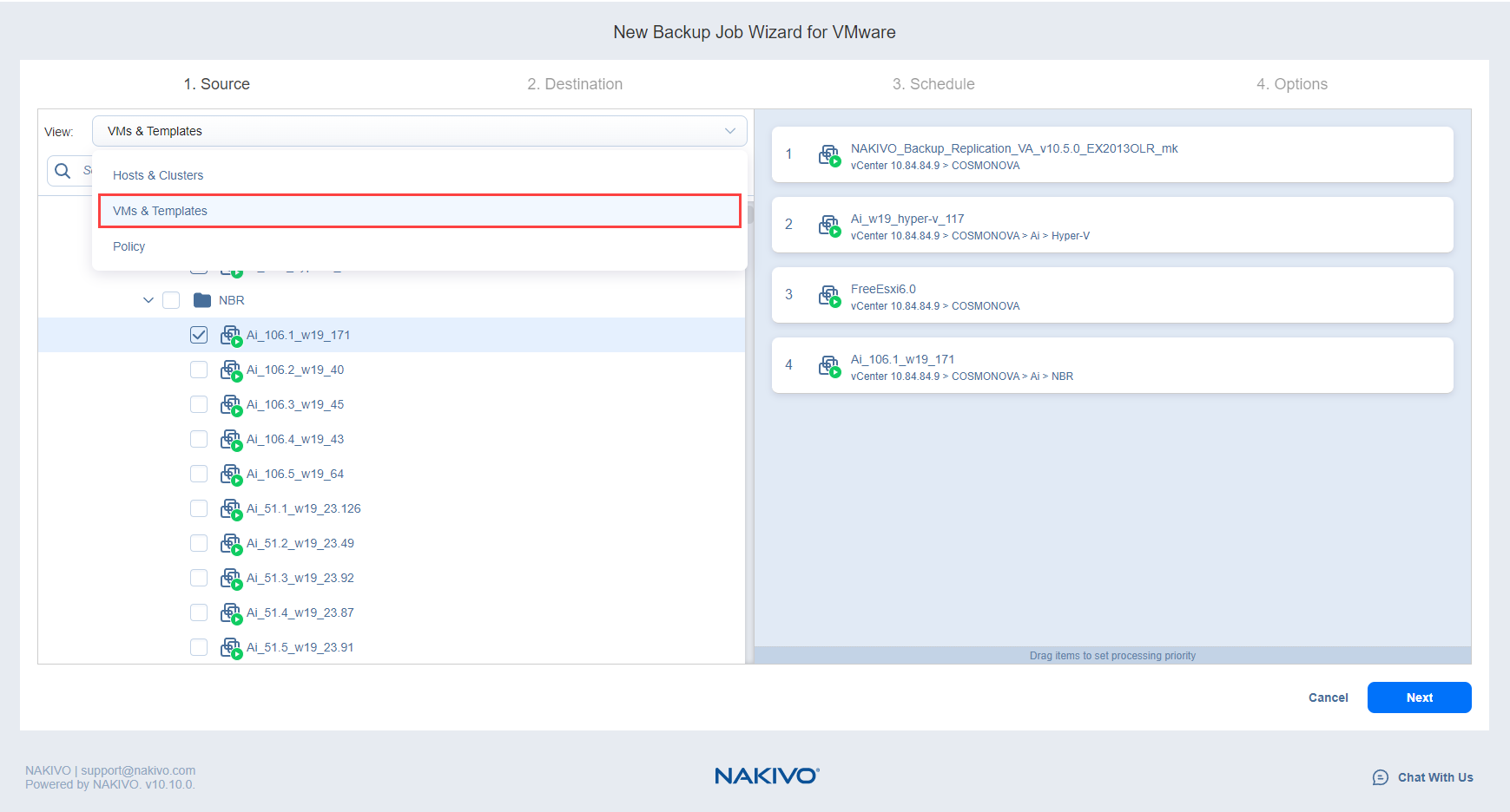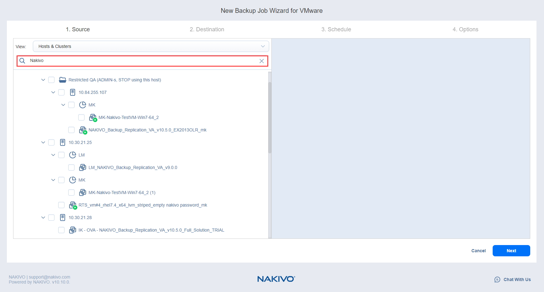 On the Source page in the wizard, you can add VMware VMs to your backup job by using one of the inventory views. Proceed as described in the sections below: