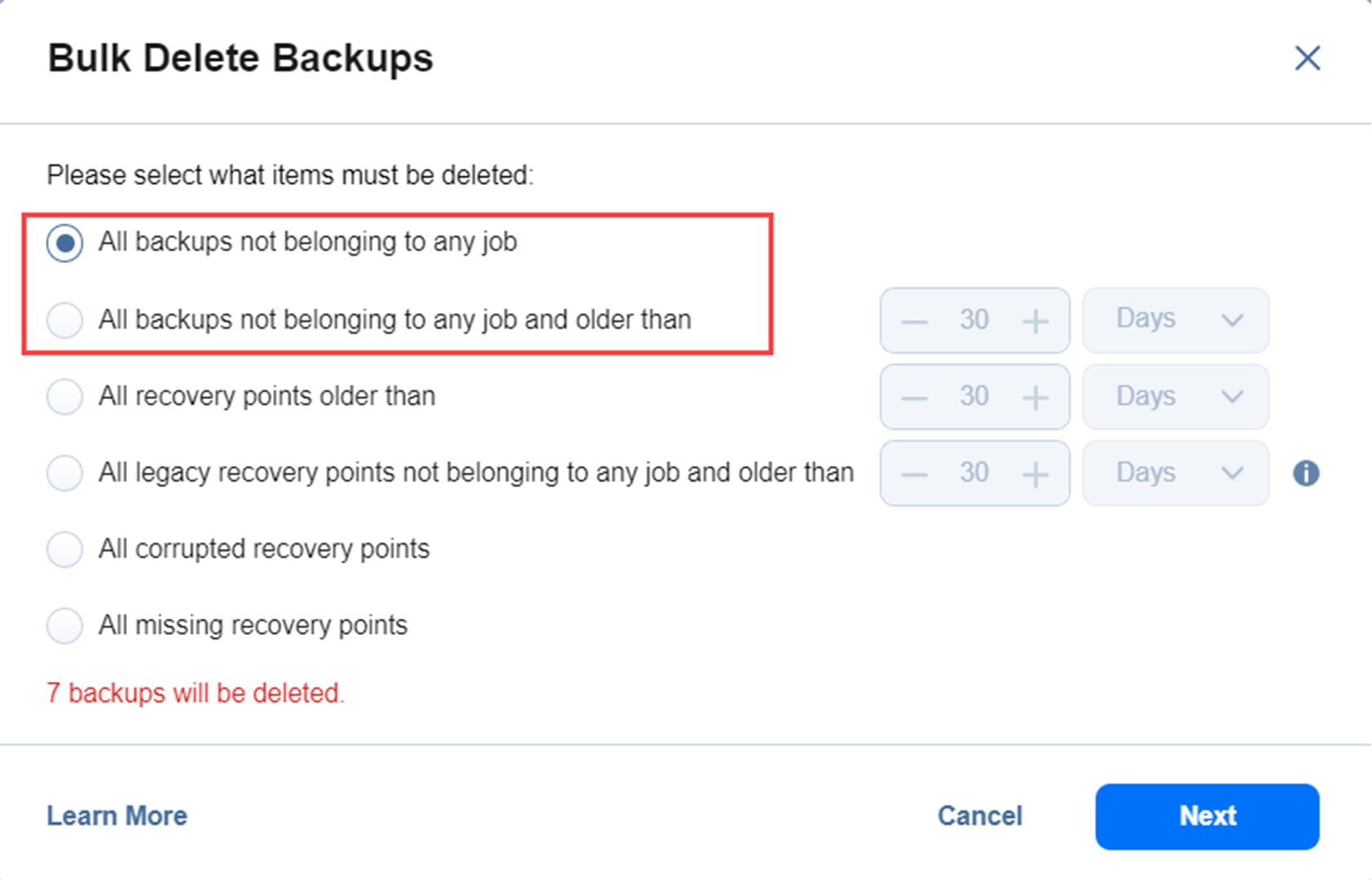 In the Bulk Delete Backup dialog box that opens, select one of the available options:
