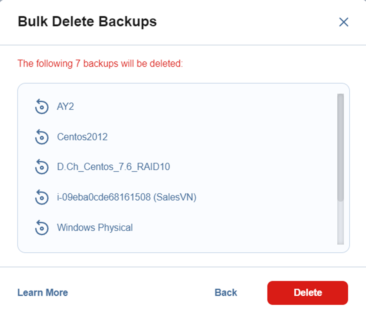 The Bulk Delete Backups dialog box opens displaying the list of backups to be deleted. Click Delete to confirm the deletion.