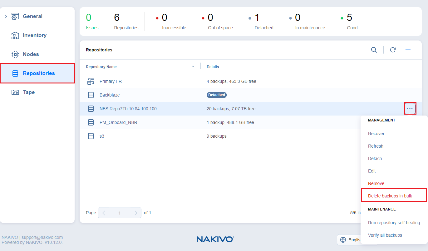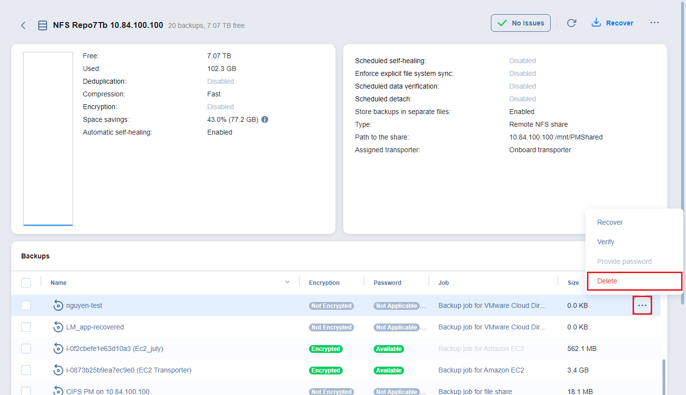 With NAKIVO Backup & Replication, you can permanently delete a backup with all of its recovery points if this backup is available in a Backup Repository. You can also delete specific recovery points in a backup without affecting any of the other recovery points. The option to delete a specific recovery point can be used if you get an alert about corrupted recovery points in a backup.