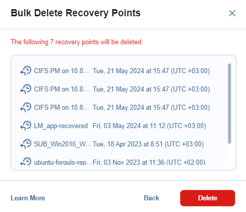 The Bulk Delete Recovery Points dialog box opens displaying the list of recovery points to be deleted. Click Delete to confirm deleting the recovery points.
