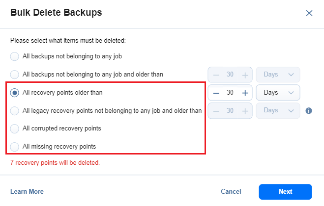 In the Bulk Delete Backups dialog box that opens, select criteria for recovery points to be deleted: