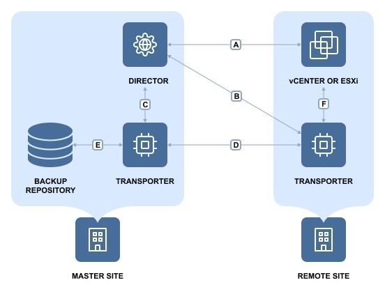 E | Connection from the machine at the Master site where the Transporter is installed to ESXi hosts at the master site where VM replicas will be created. |