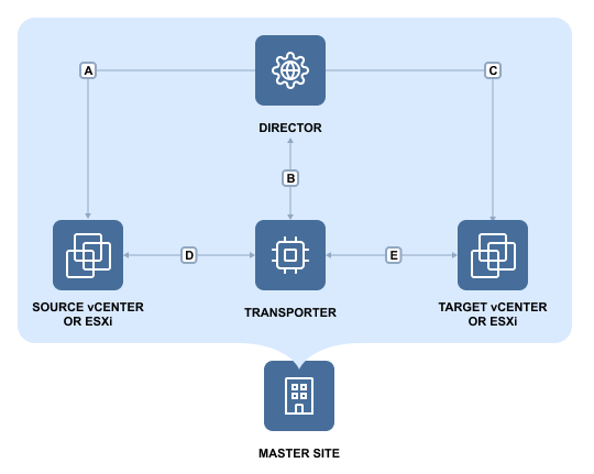 E | Connection from the machine on which the Transporter is installed to vCenter servers and ESXi hosts where VM replicas will be created. |