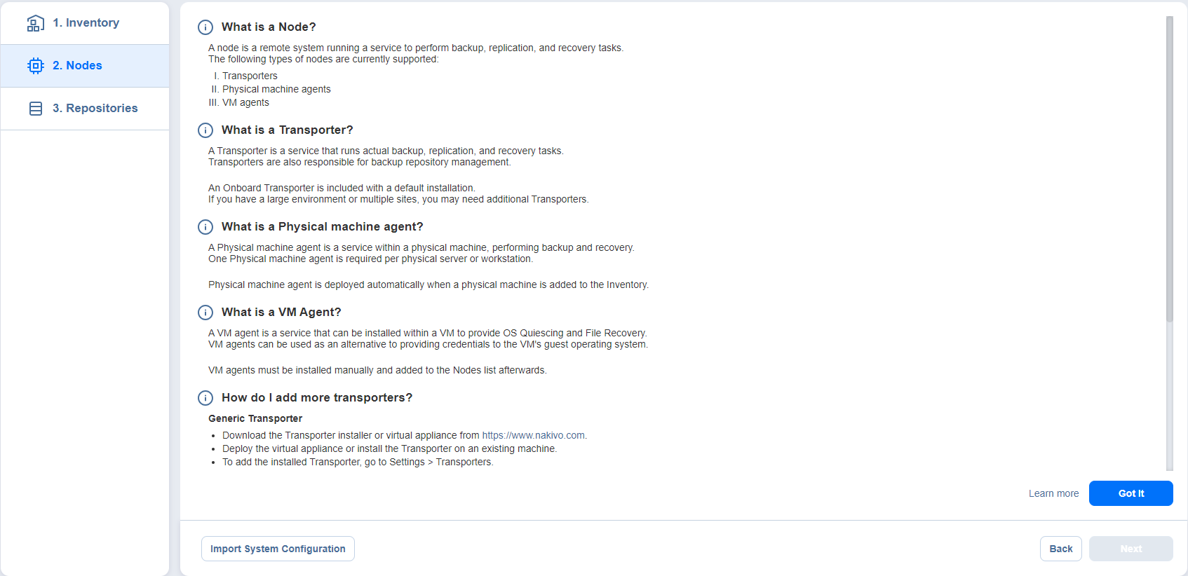On the Nodes page of the wizard, you will find information about the Transporter component of the NAKIVO Backup & Replication.