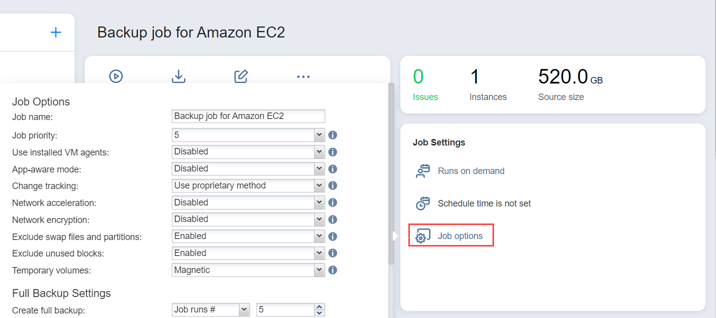 Recovery points retention: Clicking this opens a dialog box with Retention Settings for this job (if applicable)