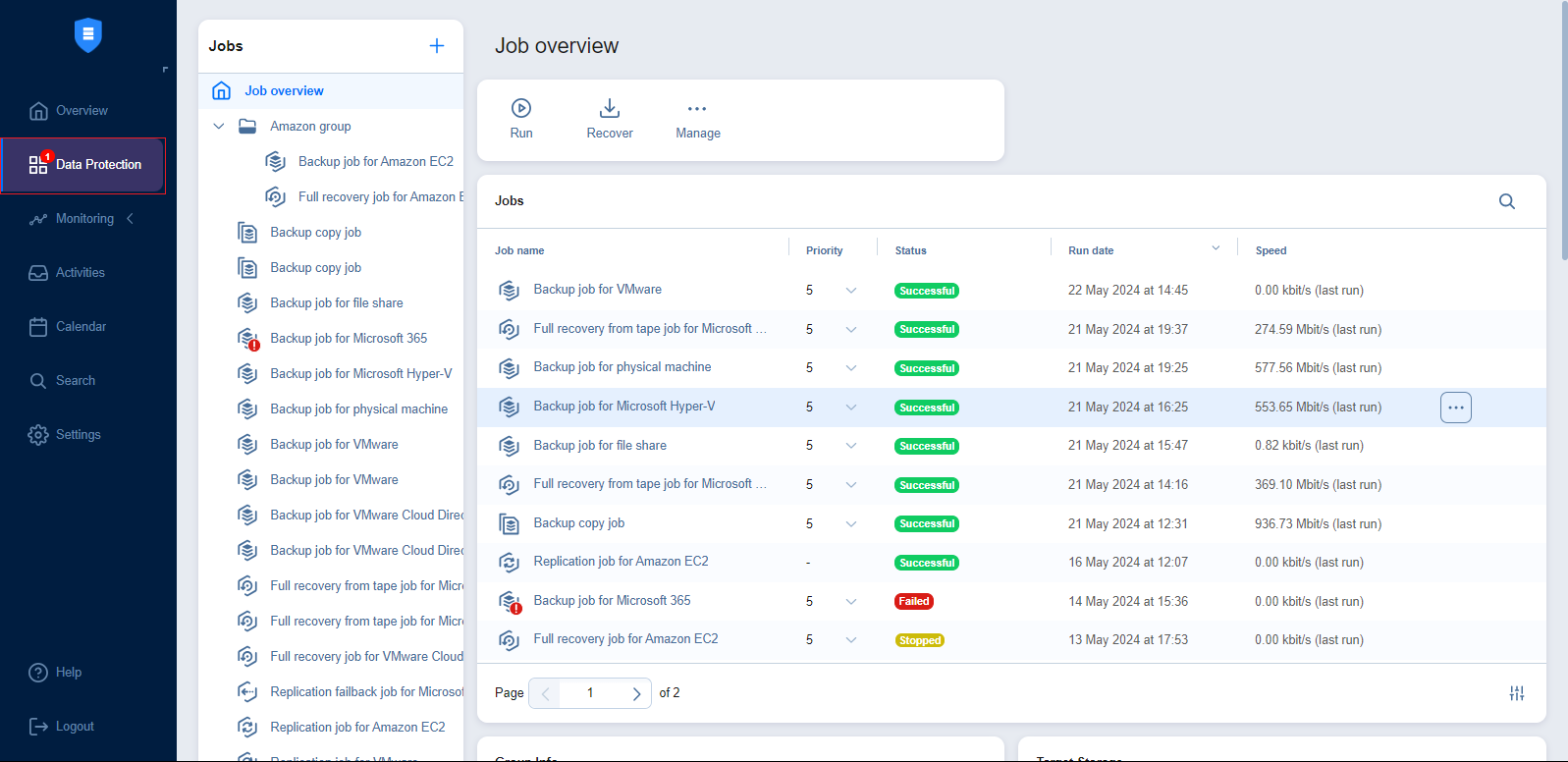 Target Storage: The target storage(s) of the jobs in the chosen group. To open the popup with additional information about it (Data storage type, Free space, Used space, Transporter, Path, Compression, Deduplication, Space savings fields), click this target storage.