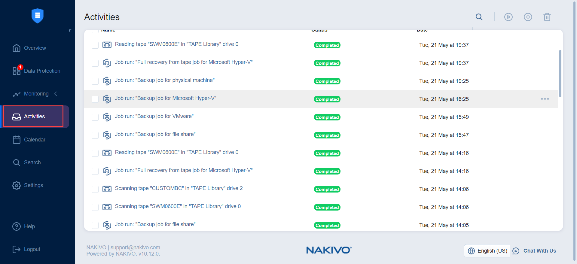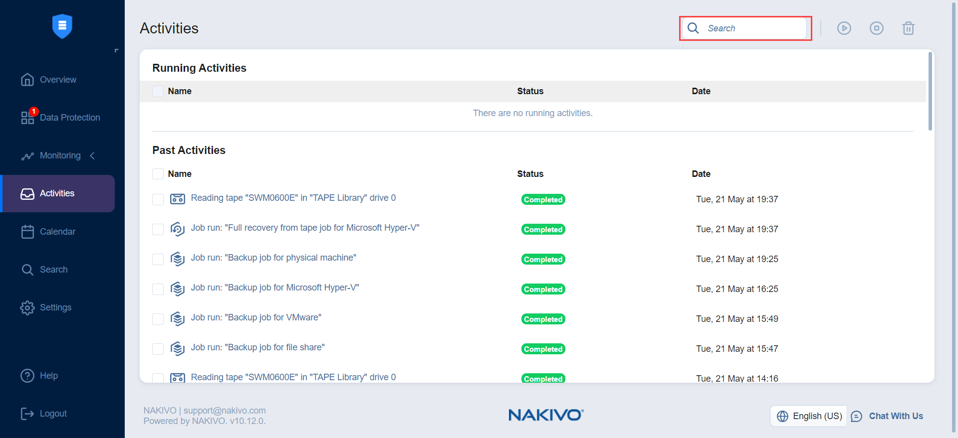 The Activities page displays current and past tasks performed by NAKIVO Backup & Replication. From this dashboard, the following actions can be done: