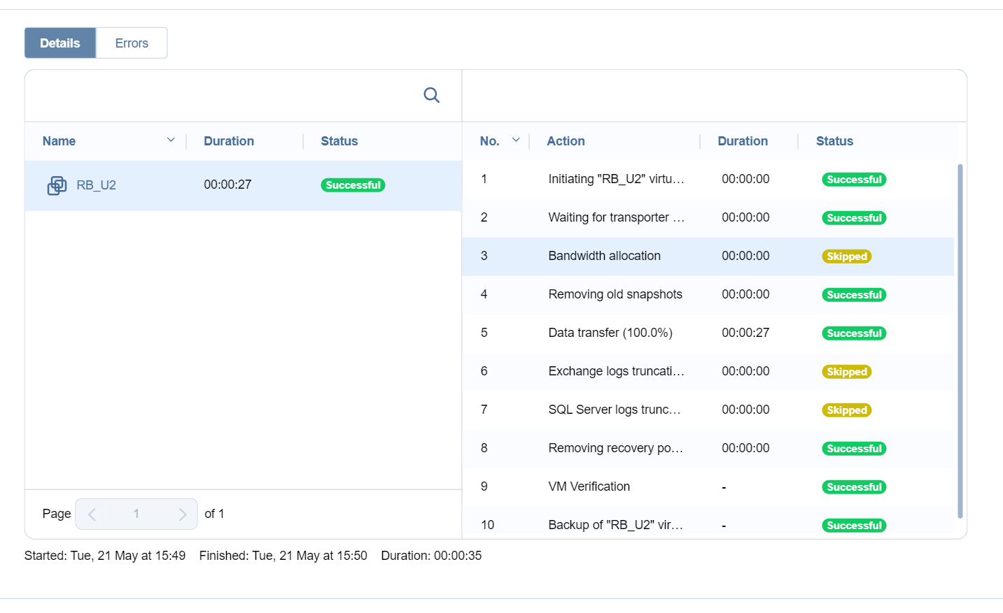 If the job was never retried, the right pane shows the actions that NAKIVO Backup & Replication took when running this job.