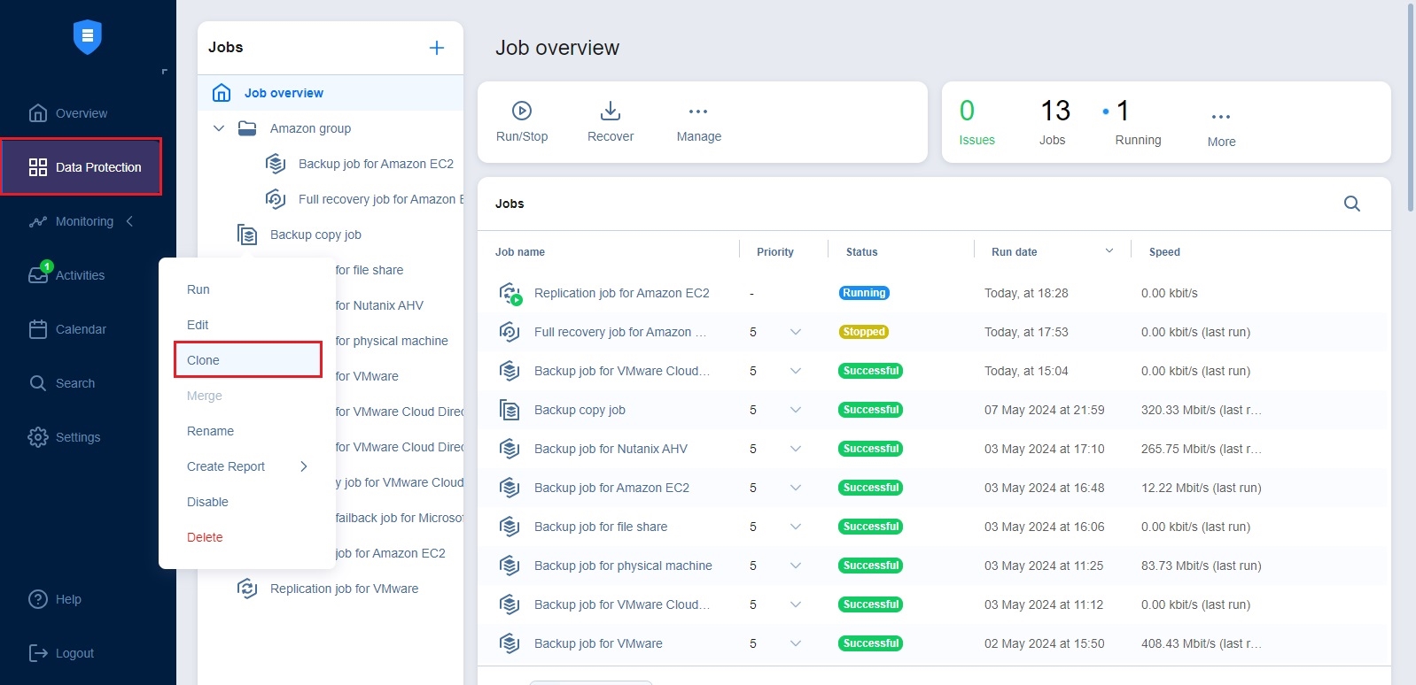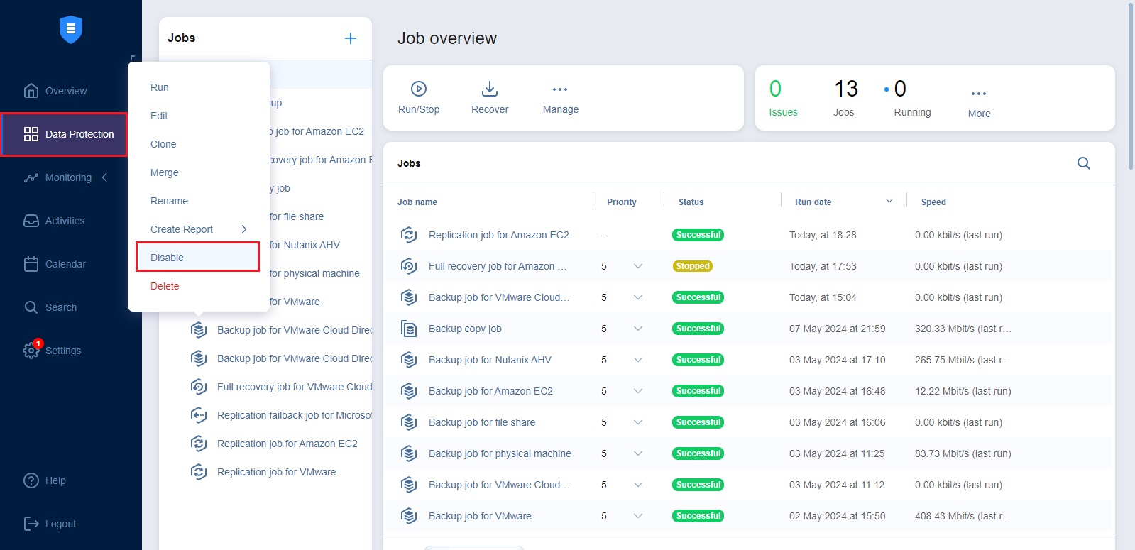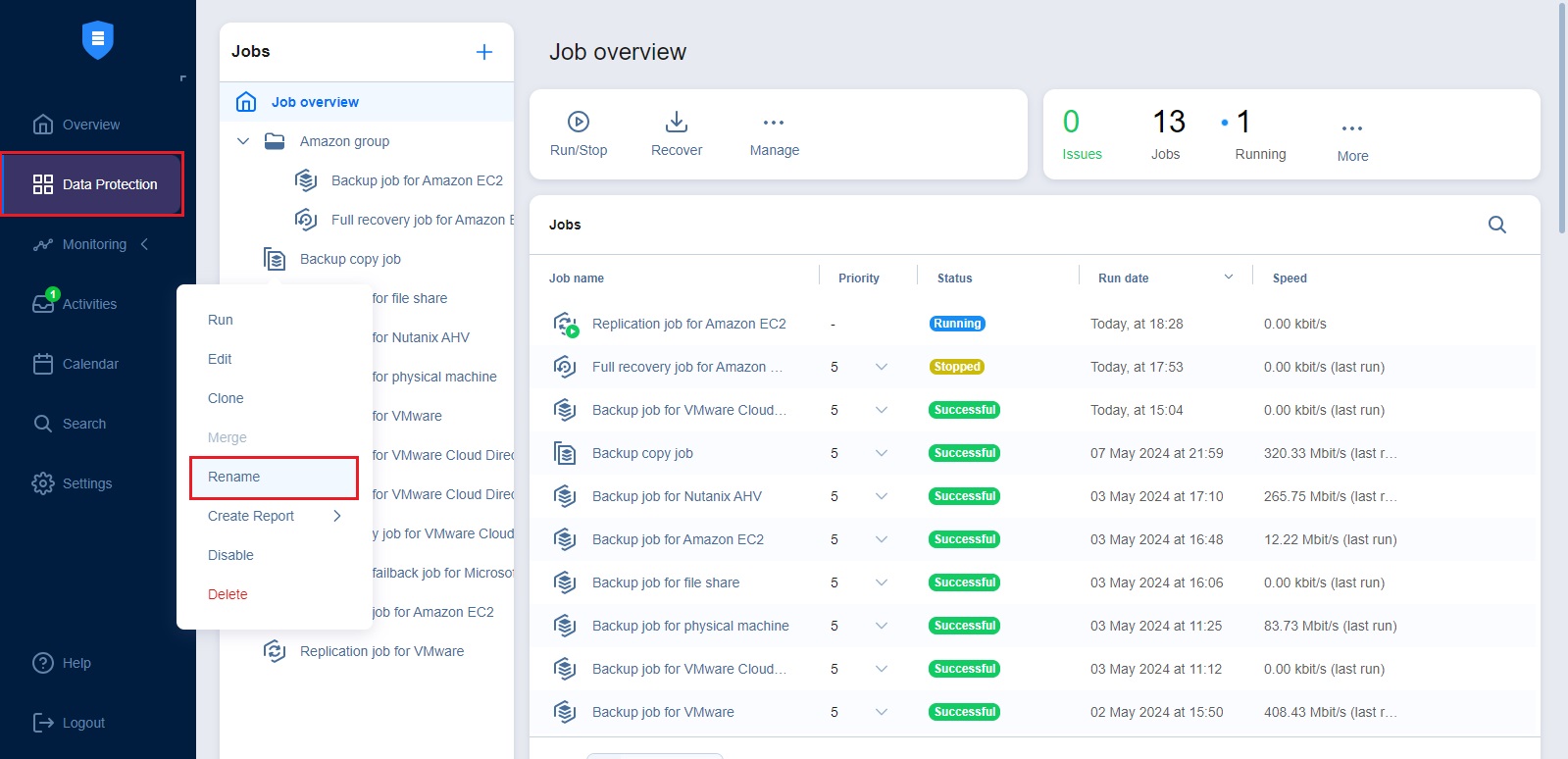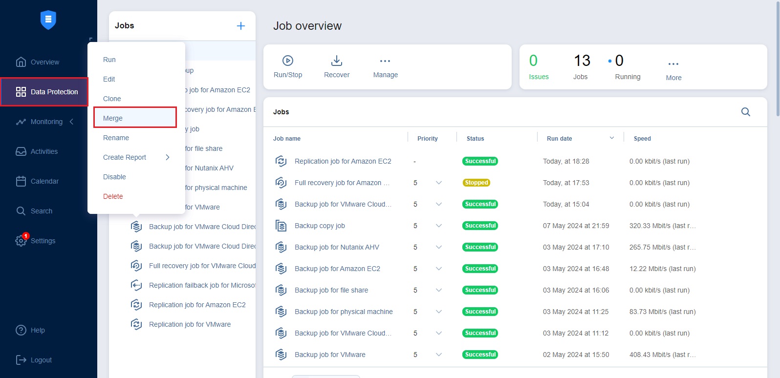 Using the Data Protection menu, you can easily manage jobs. Use the Manage menu to rename, edit, merge, delete, and enable/disable jobs.