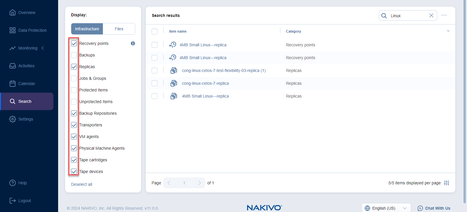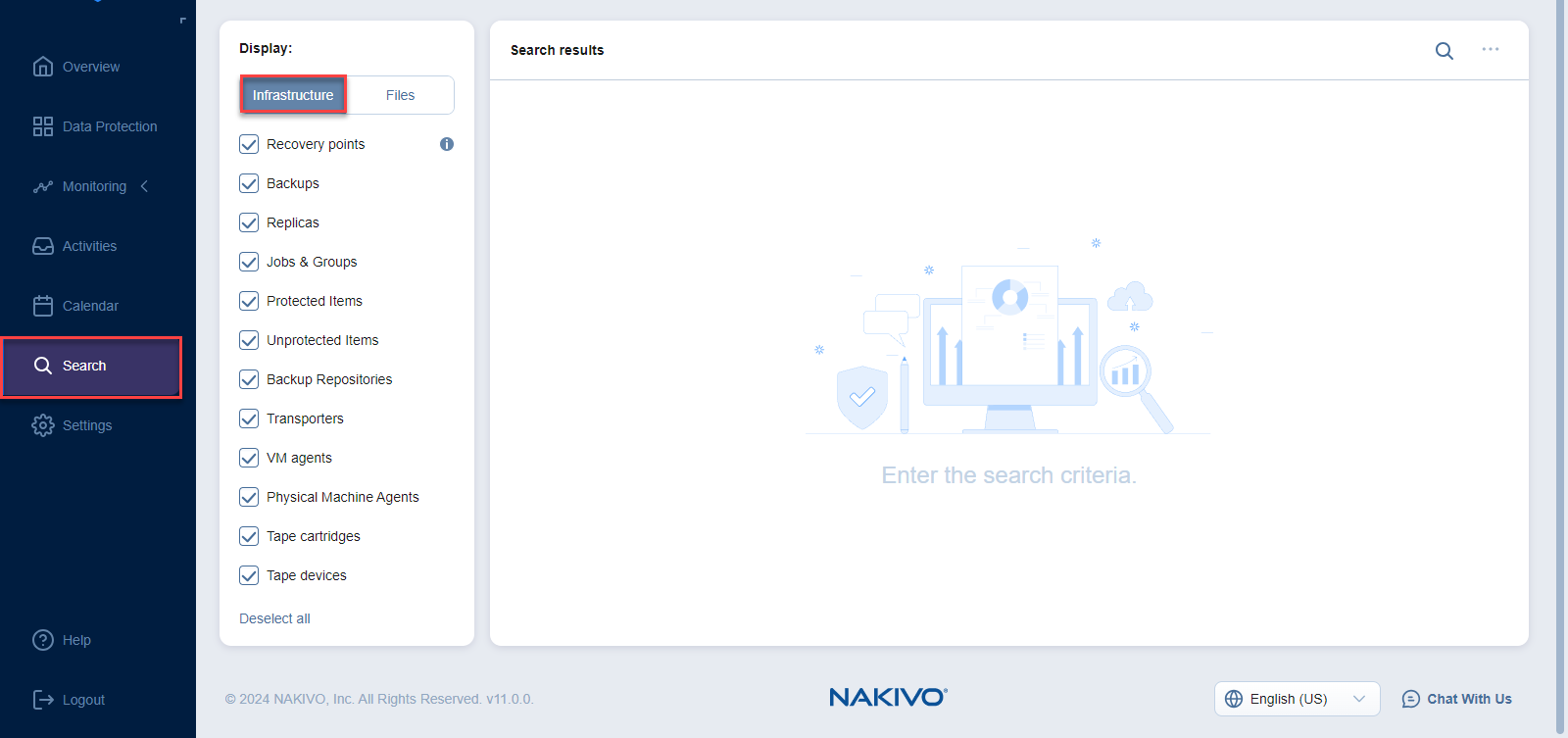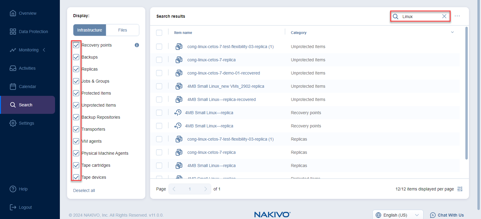By default, your search results are non-filtered. This means that the search is applied to all categories of NAKIVO Backup & Replication objects that are enabled by default.