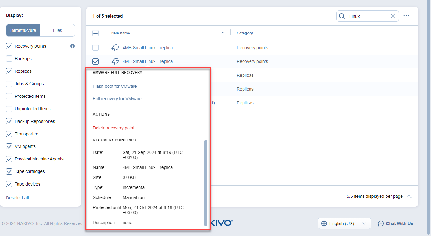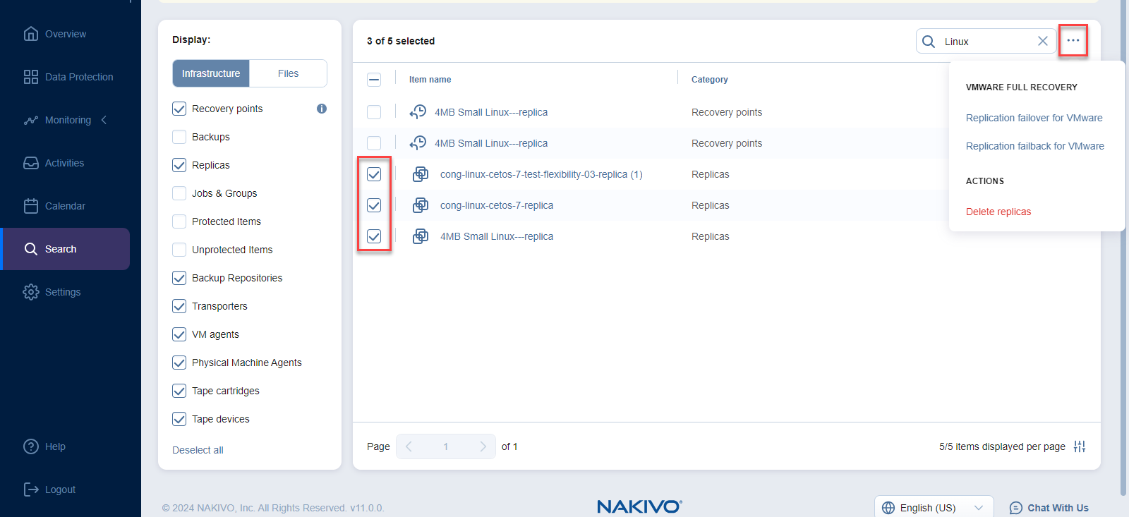 With NAKIVO Backup & Replication Global Search, you can apply a bulk action to objects belonging to the same category and of the same type.