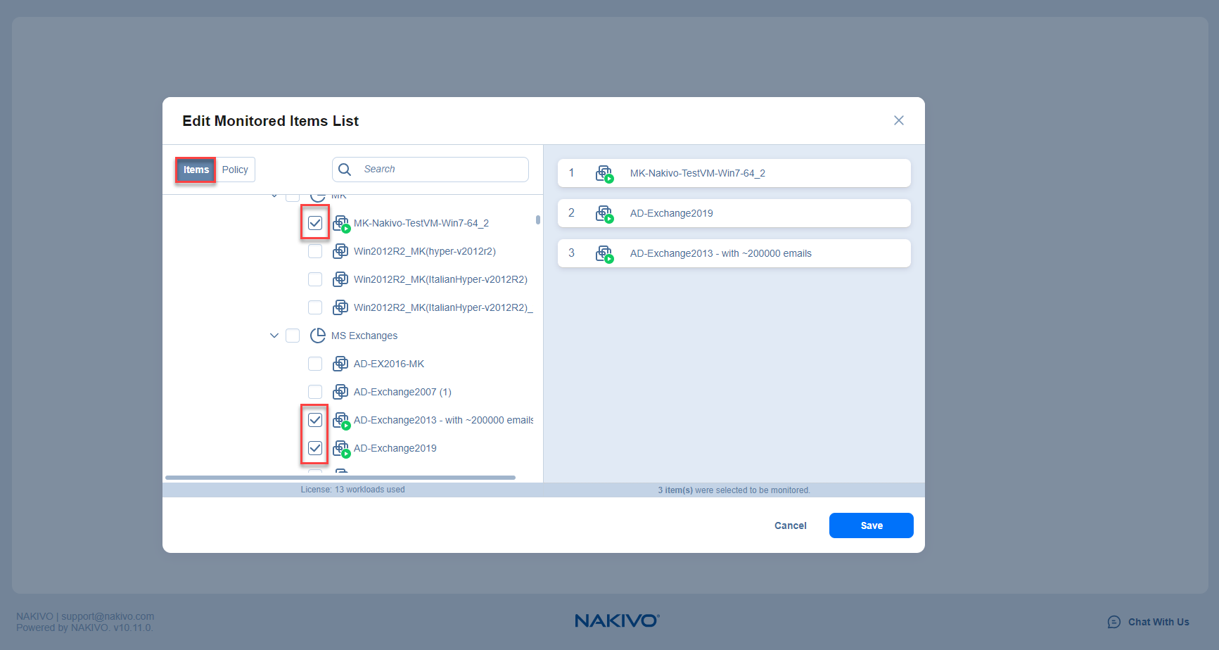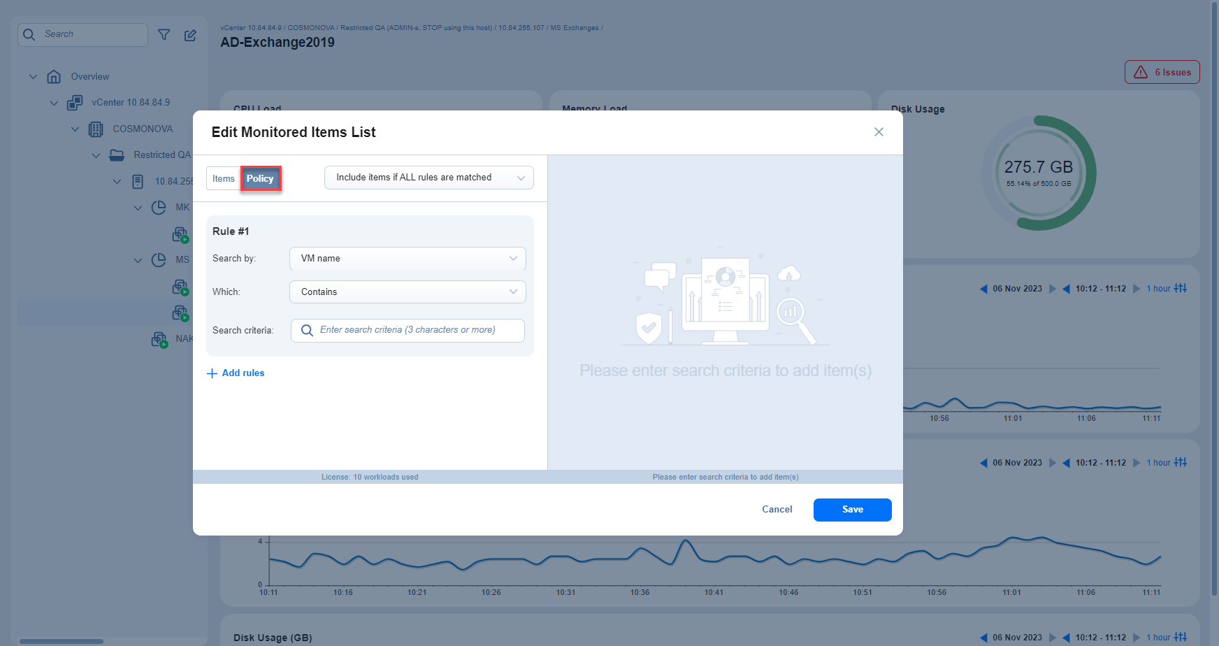 On the left side, choose the items you want to add for monitoring. Alternatively, you can set up policy rules to automatically add inventory items for monitoring.