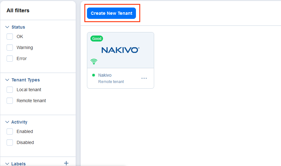 This section covers the topics describing the remote tenant creation process. Creating and configuring a Remote tenant allows a Master tenant to monitor a standalone instance of NAKIVO Backup & Replication. The remote tenant account retains the ability to manage the resources in the client’s data protection infrastructure.