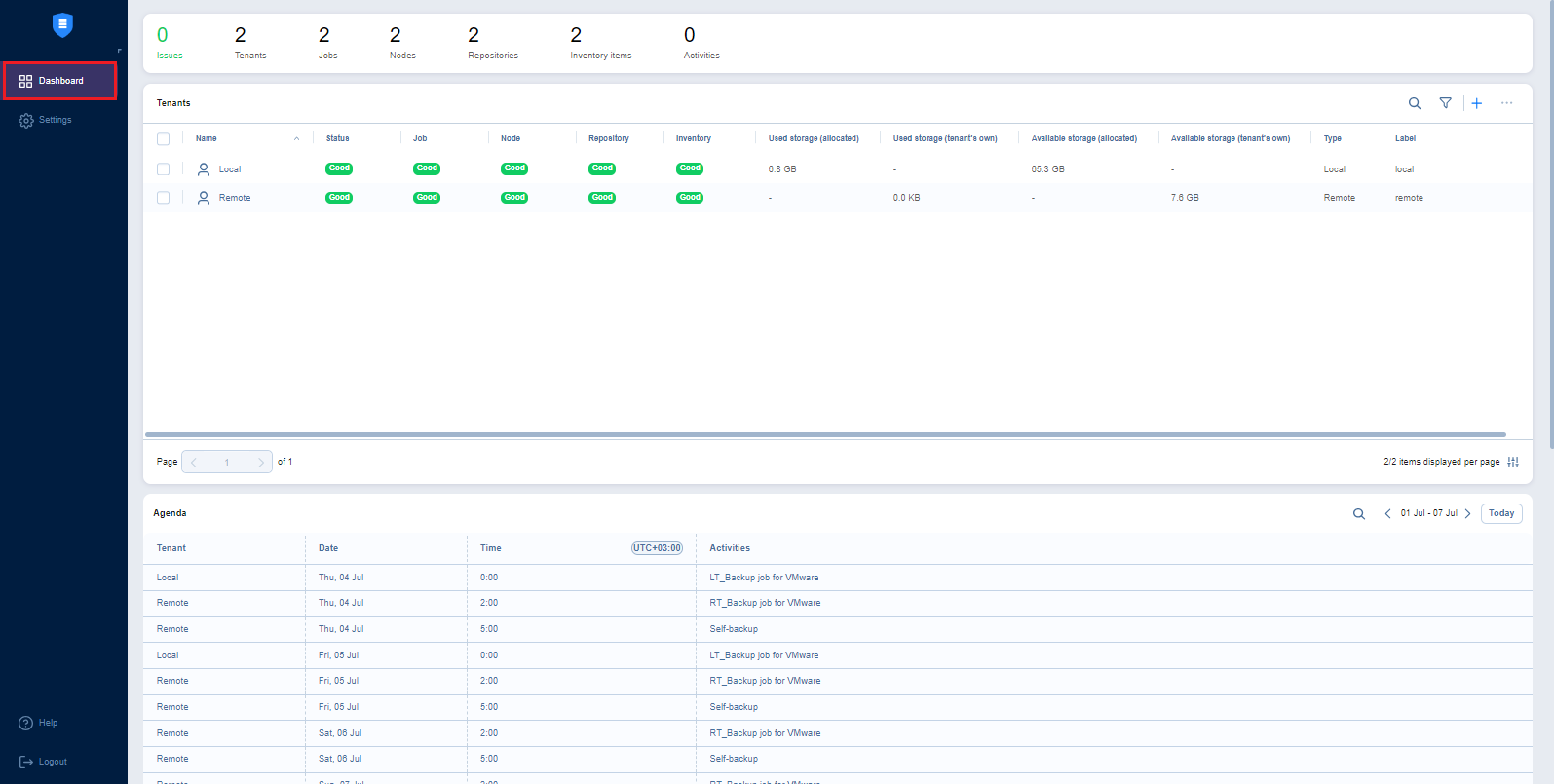The MSP Console displays the key statistics for each local and remote tenant in the MSP’s instance of NAKIVO Backup & Replication.