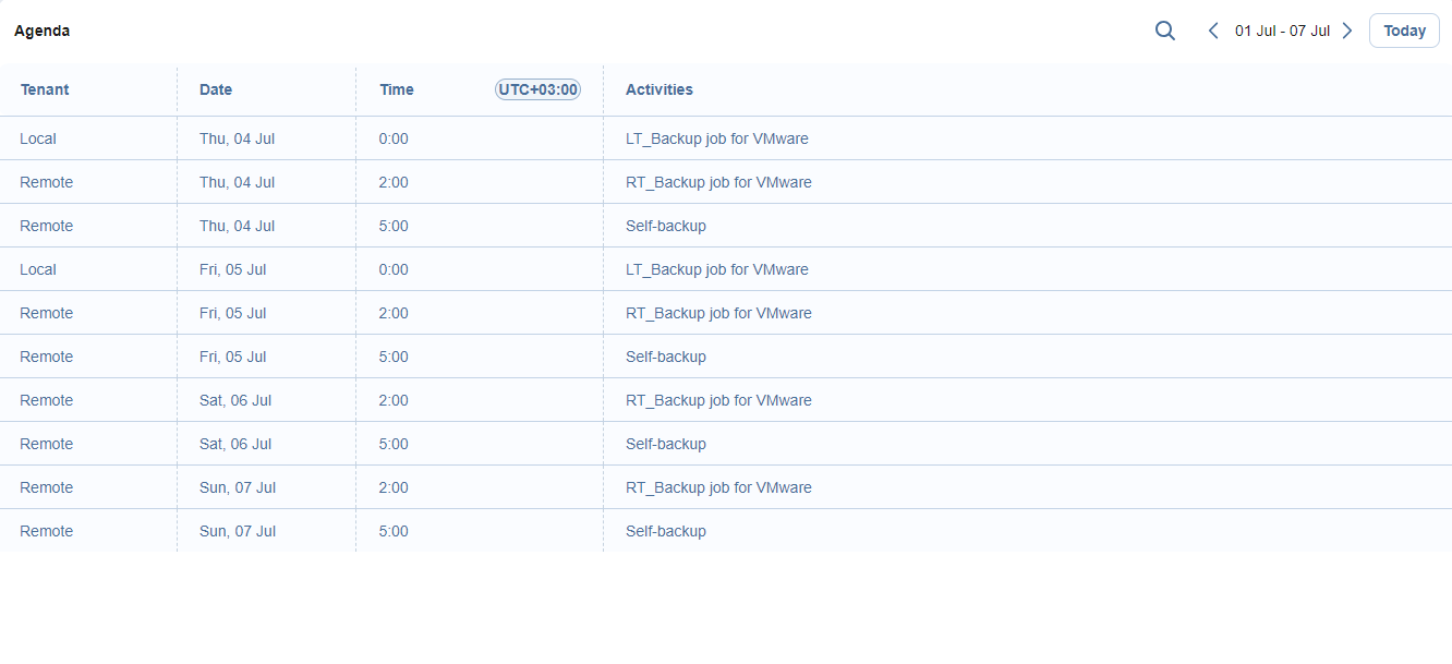 The Agenda widget allows MSPs to view information about all the running and scheduled activities of tenants (except for Disabled, Inaccessible, and Disconnected tenants).