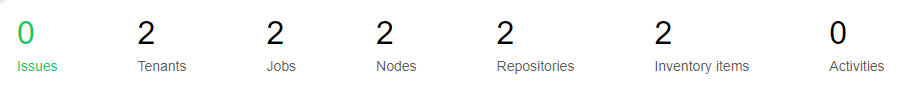 The Summary bar displays the following data collected from tenants: total number of issues (errors and notifications), tenants, jobs, nodes, repositories, monitored items, and running activities.