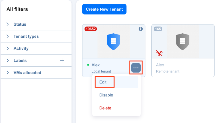 Hover over the tenant card and click the ellipsis Manage button, then click Edit.